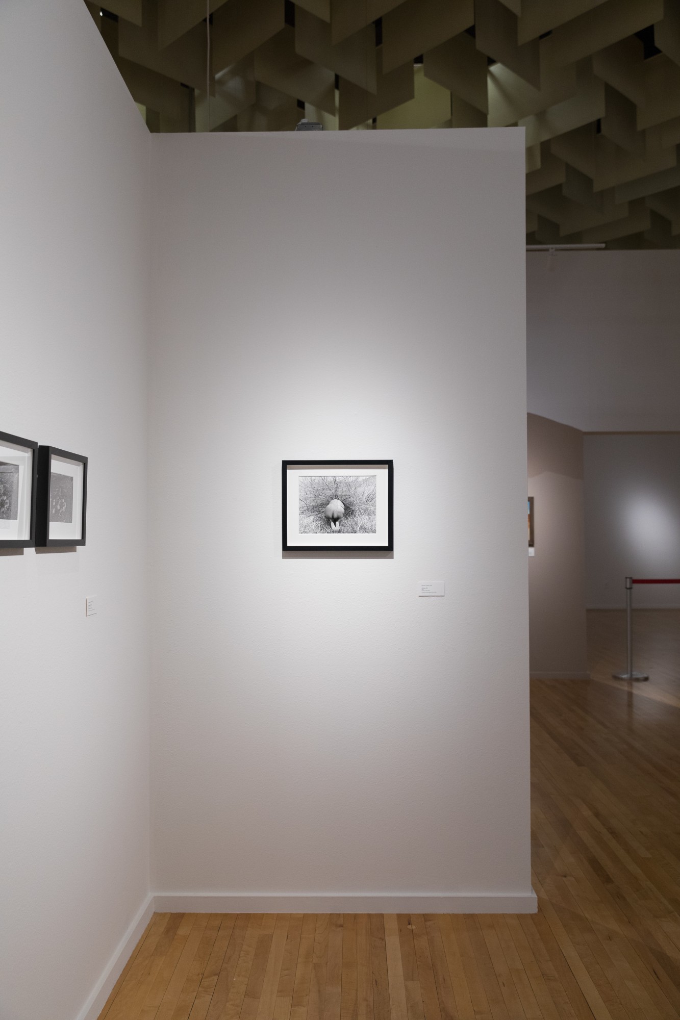 Item description: A black and white photograph centered on a woman on her knees facing away from the camera. The woman is curled up beneath a dead shrub whose branches extend upward from where her head should be. Deep shadows concentrates at this spot, enveloping the woman, which dissipates into less contrasting greys and whites for the surrounding forest scenery of twigs and undergrowth.