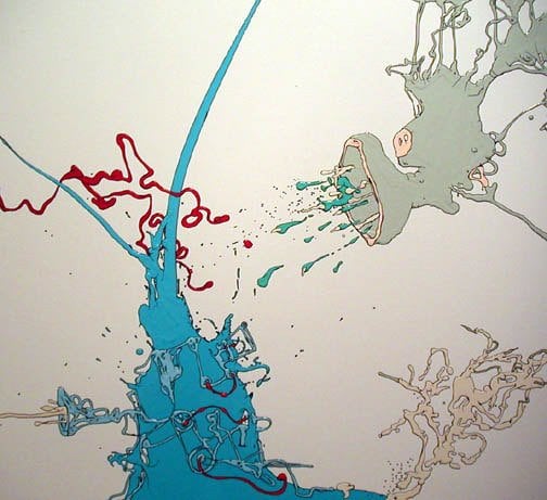 A painting composed of several colored shapes with squiggly biomorphic outlines. The shapes are positioned as if they are interacting. A greenish shape in the top right corner of the work is spitting green-blue drops from a circular open ‘mouth’ towards a blue spiked shape standing in the center. A red line encircles the blue shape’s longest spike while a beige shape flows diagonally across the lower right corner. (written by Andrea Noonoo.)