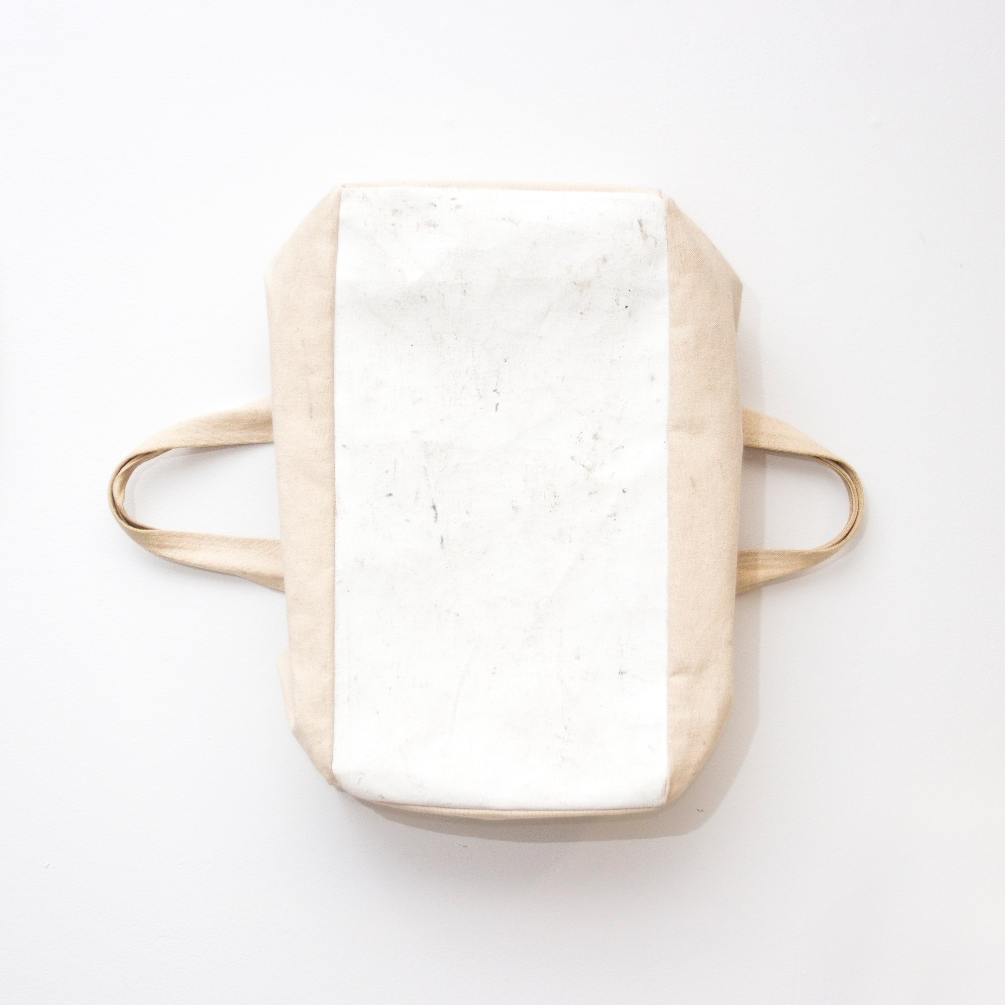 A cube-shaped bag made from off-white canvas with wooden stretcher bars around the opening. Two handles made from the same canvas have been sewn to the sides of the bag.