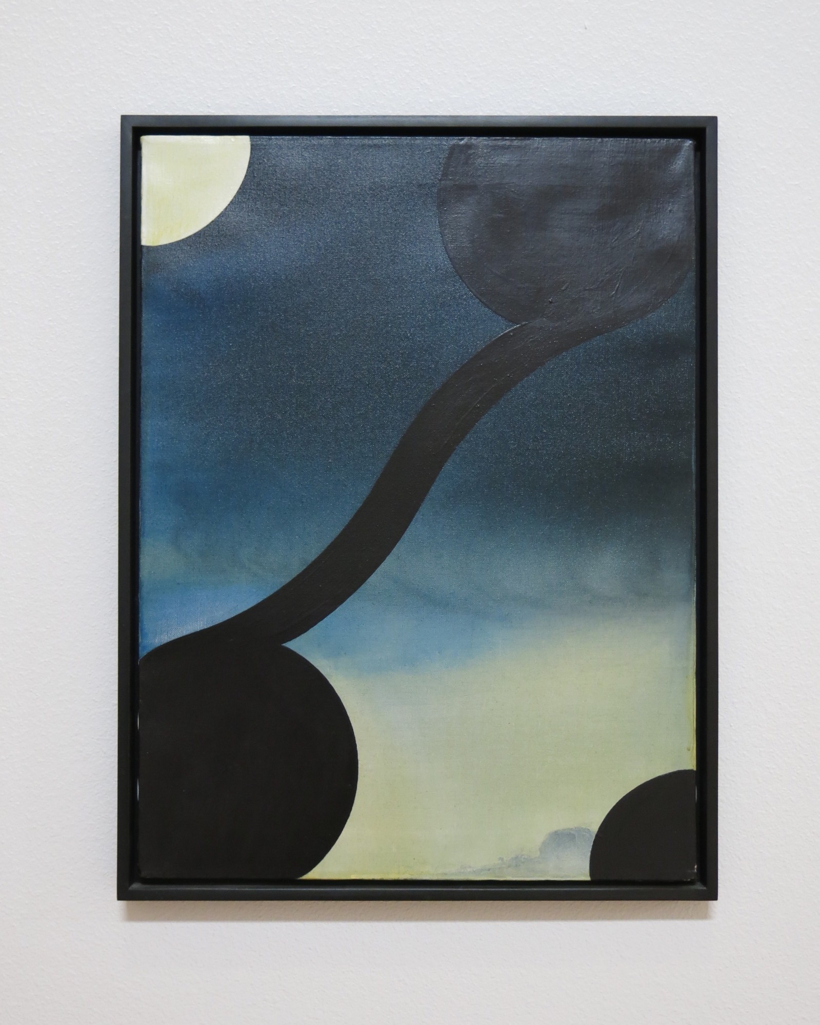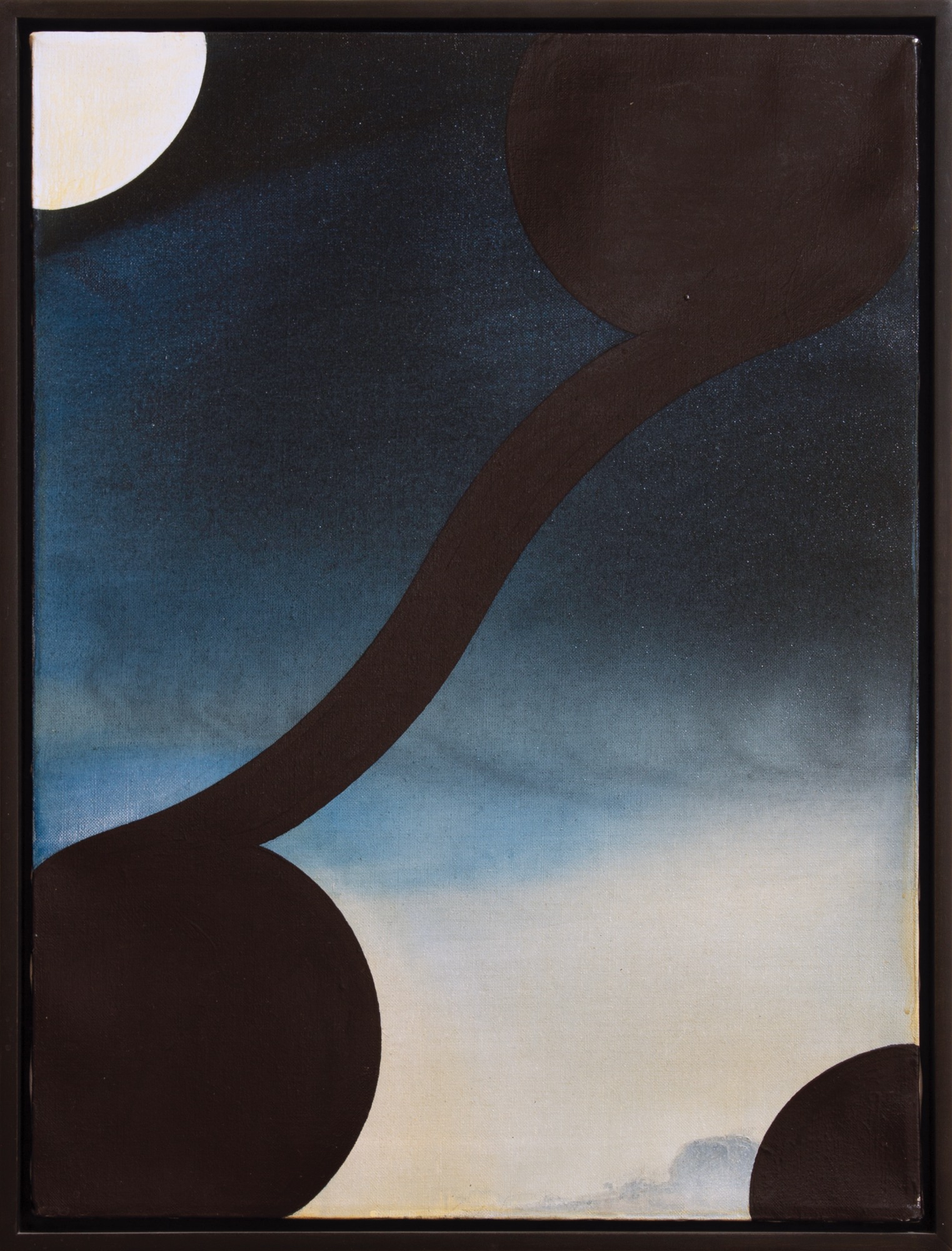 Untitled is haunted by the unstated presence of the German Romantic painter Caspar David Friedrich (1774–1840). Gary Stephan’s blue, white, and black palette suggests Friedrich’s crepuscular landscapes. The human figures who contemplate the scenery in Friedrich’s pictures are, however, absent. Stephan wanted to explore the mood of the German artist’s work without perpetuating the notion of a heroic human figure and decided to instead use abstract shapes, traced from cardboard templates, to hint at the role of a protagonist without fulfilling it. The undulation that runs diagonally across the sky-like background is one example of the templates he created. Solidly black it posits the existence of two worlds, one in which skies are possible, and another that exists two-dimensionally, as pure shape, affected by the pressure of the edges and corners that cut against it. The surreal atmosphere this creates is a frequent feature of his painting. (DKS)