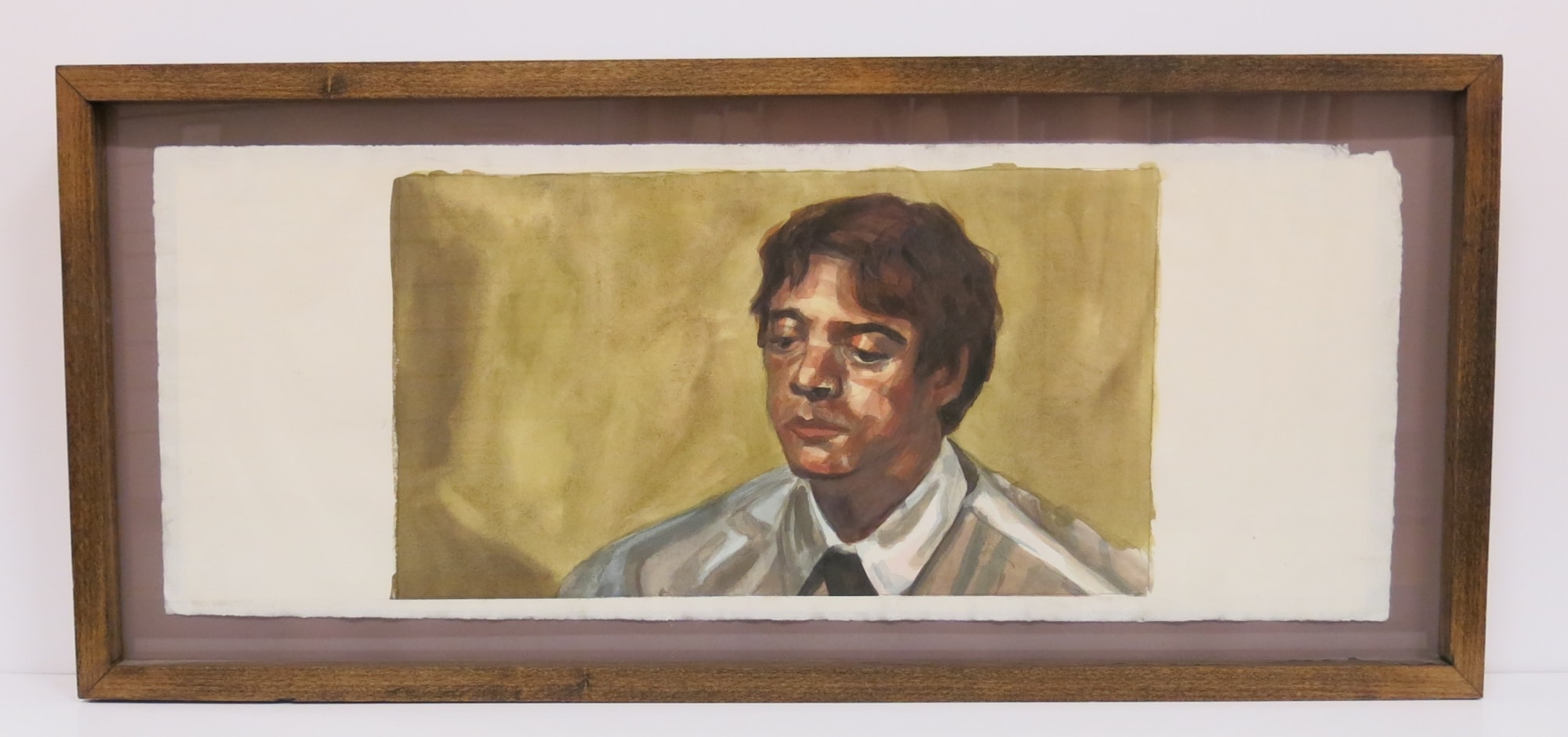 A framed watercolor portrait of a man in a light-colored suit coat and dark tie on a gold background. He gazes down, his expression pensive.