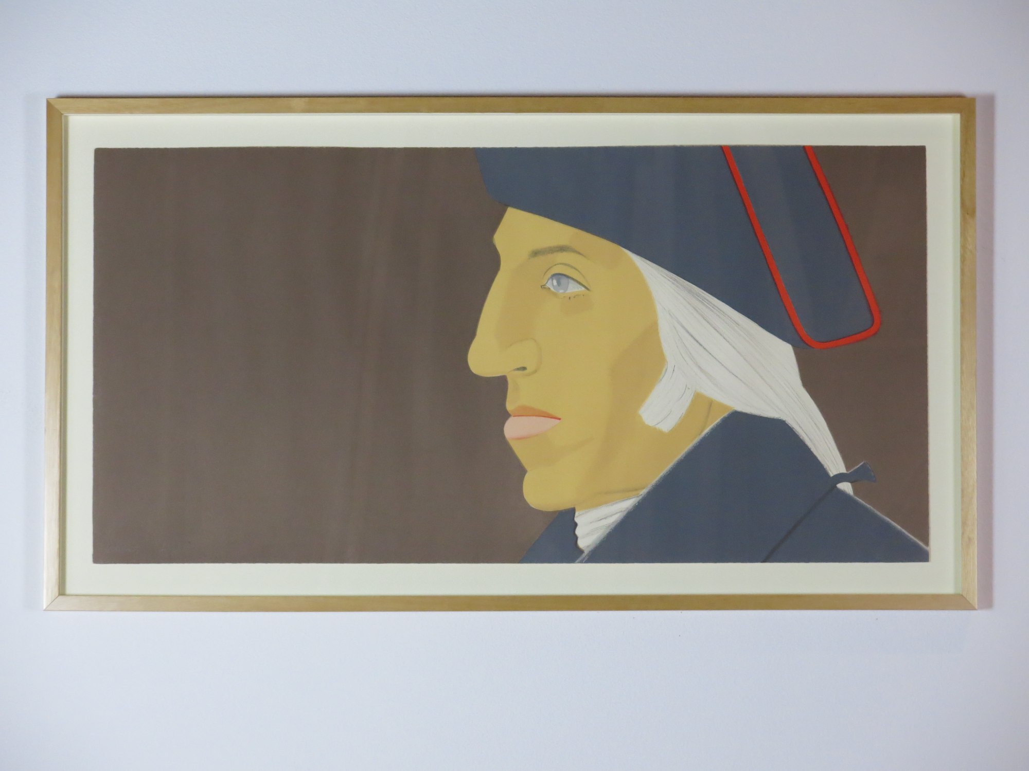 Item description: A stylized image of a man’s face in profile facing left. His cheekbones are sharply defined with shadow. He wears an old-fashioned stock tie and a tricorn hat with a red rim. His long white hair is tied back with a ribbon. The background of the image is brown (written by Andrea Noonoo).