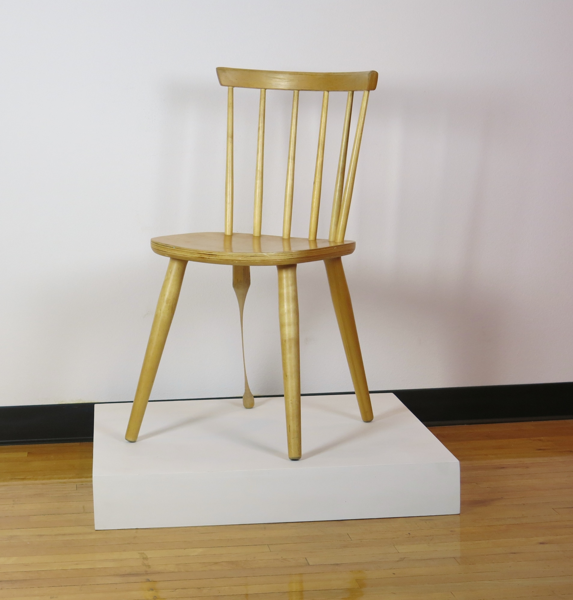 Item Description: A wooden dining chair stands on a low, white platform. The middle section of the chair’s back left leg narrows until it is thin and pencil-like.