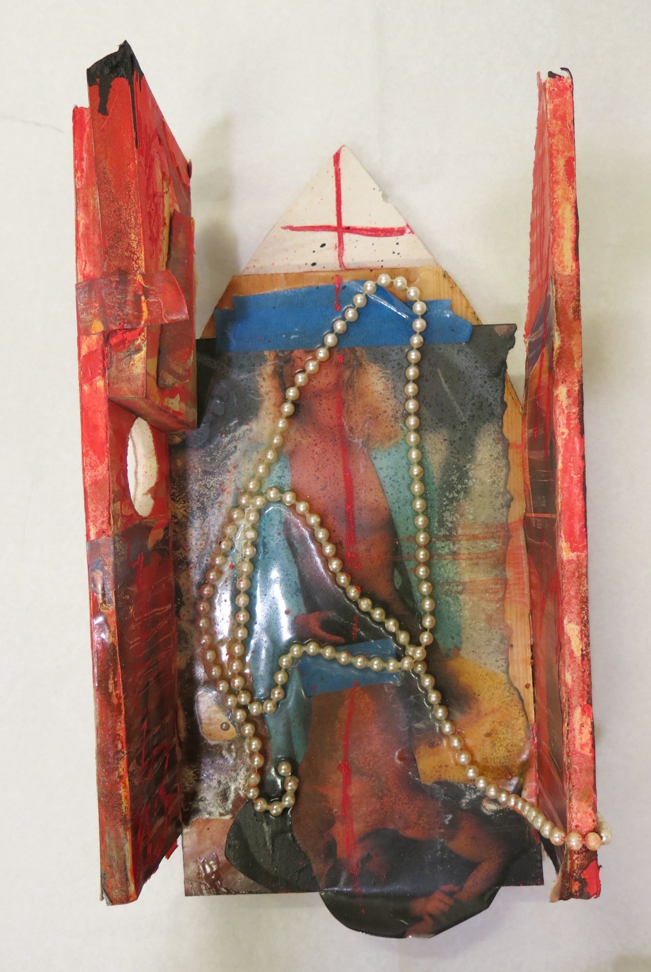 Oil, acrylic, pastel, photo collage, blue tape, foamcore, plastic pearls, resin on wood