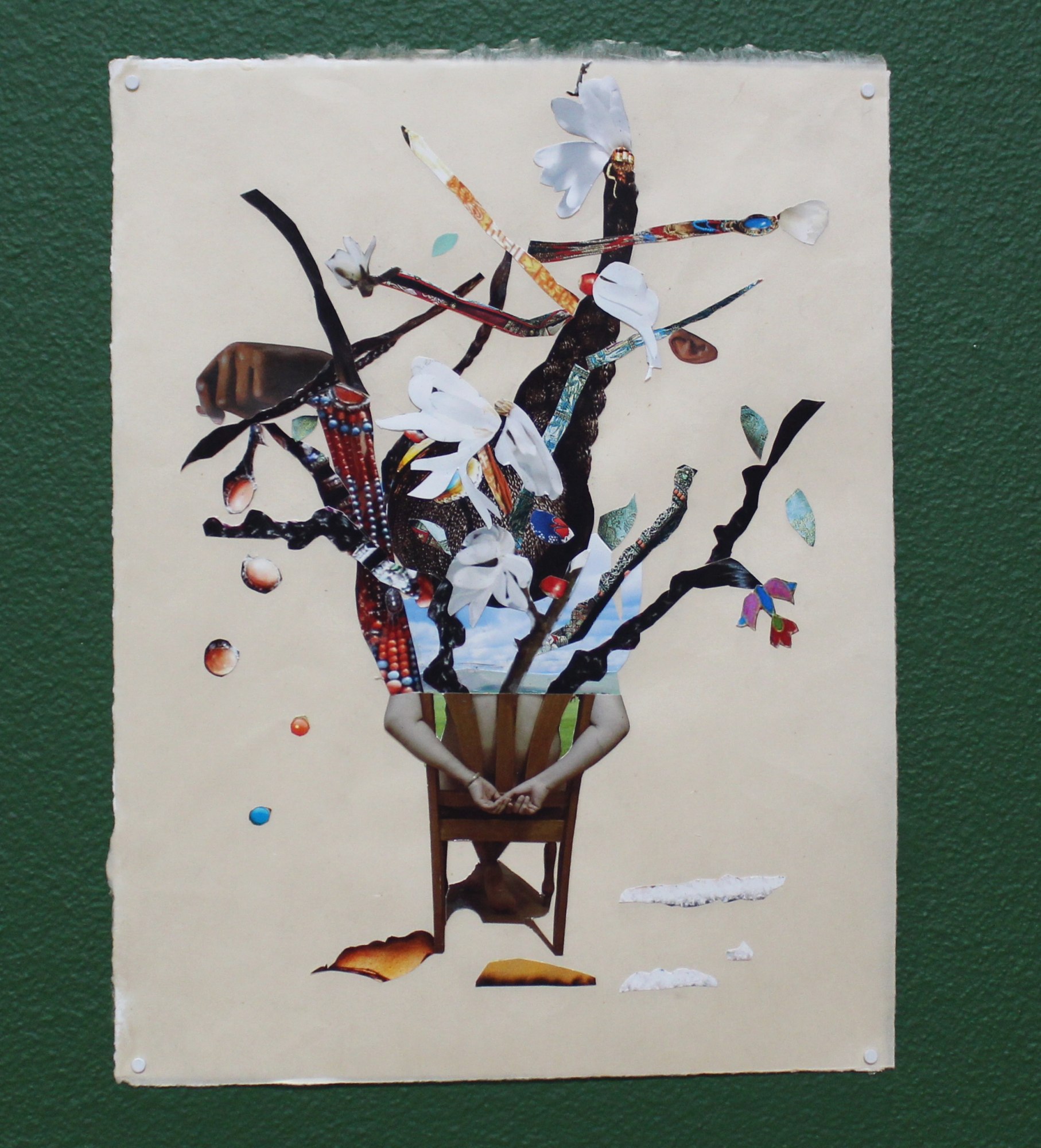 A paper collage depicts various objects extending branch-like from the naked upper torso of a person facing away from us. The figure’s arms are wrapped around the back of the chair they are sitting in. Several objects drop from the branches like falling leaves.