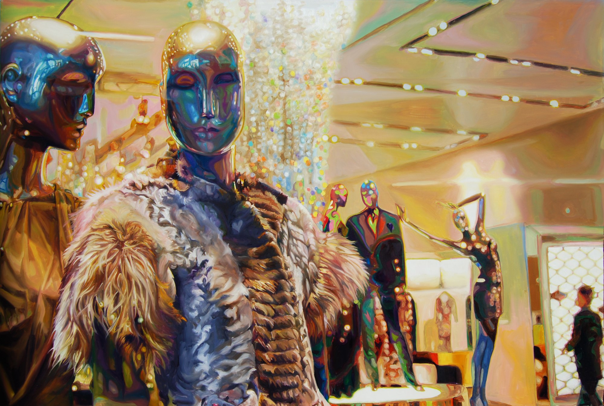 A painting of robot-like mannequins posed in fashionable clothing. In the foreground, a mannequin faces straight forward while another mannequin looks at it. Behind them, a chandelier hangs from a ceiling lined with lights.