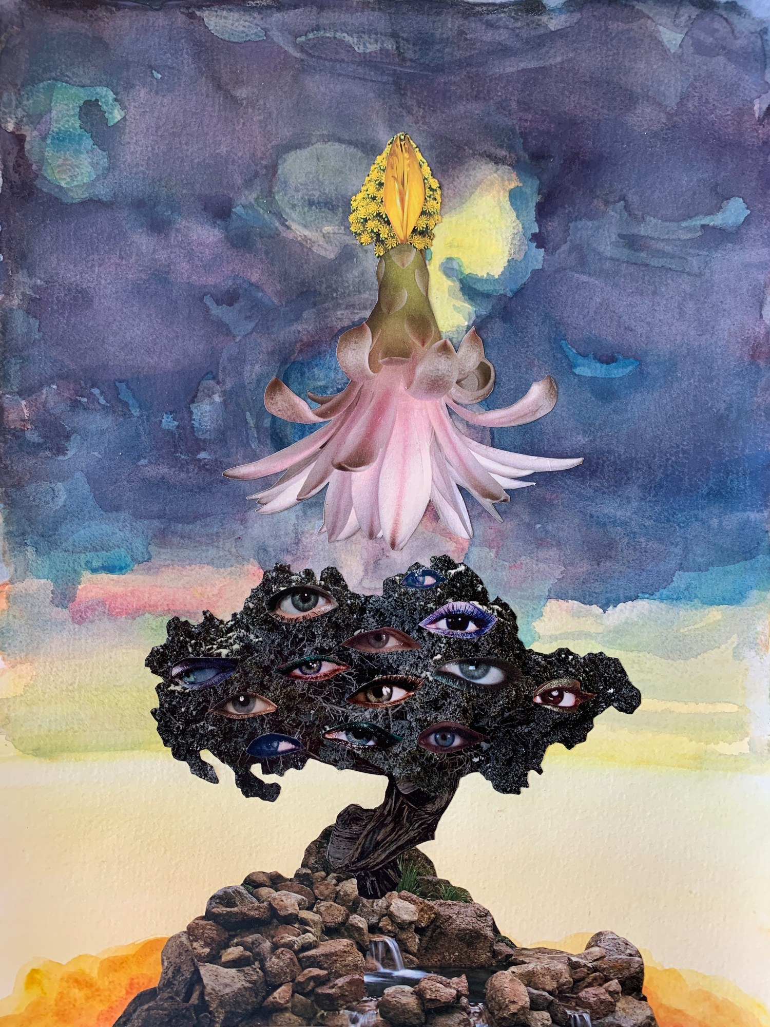 A paper collage of a tree with branches full of eyes growing from a rocky outcrop. The sky is a swirl of various shades of blue that gradually lightens in the distance. Hovering overhead, the petals of a pink flower point downwards to the tree while its stem and an open, yellow seed extend upwards into the sky.