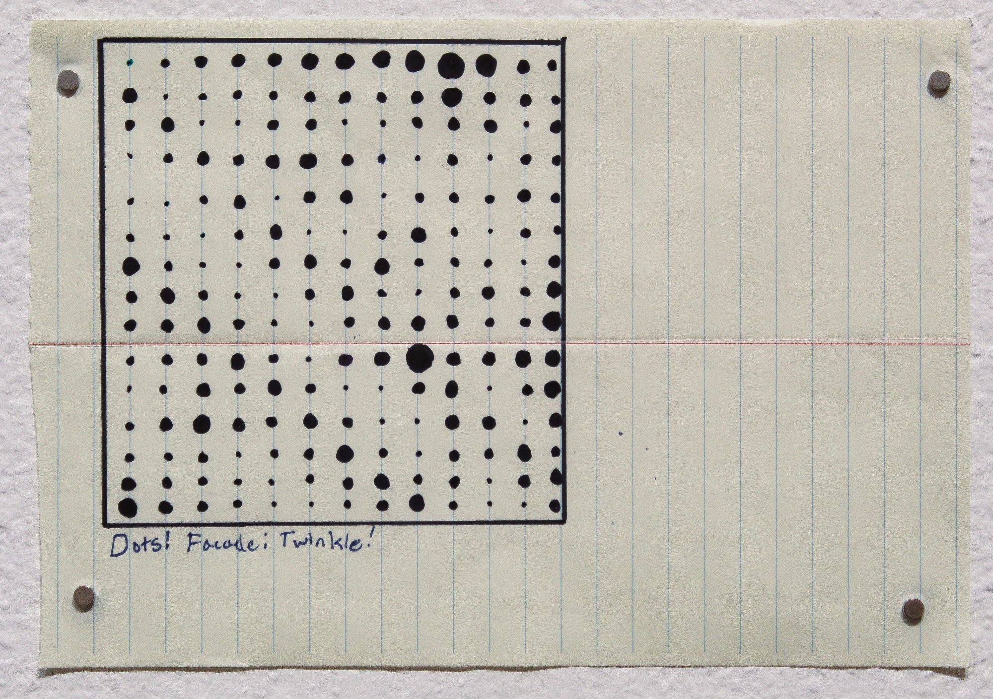 An ink drawing on lined paper depicting a square filled with a pattern of various sized dots. Hand-written text below the square reads, “Dot! Facade: Twinkle!”