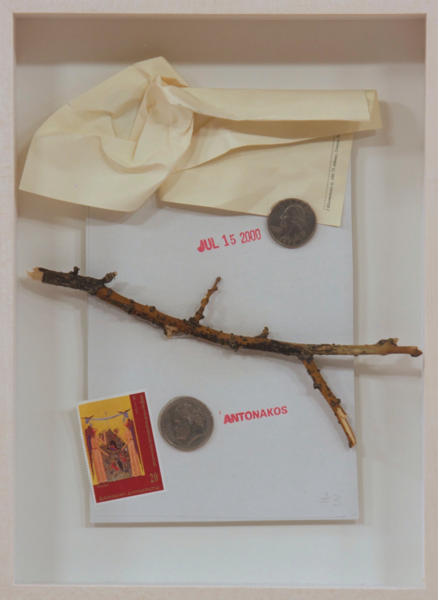 A mixed media collage that includes a crumpled sheet of black paper positioned over a horizontal stick, a Greek stamp decorated with an illustration of two angels in pink robes, and the words “Antonakos” and “July 15, 2000” stamped onto the work in red ink.