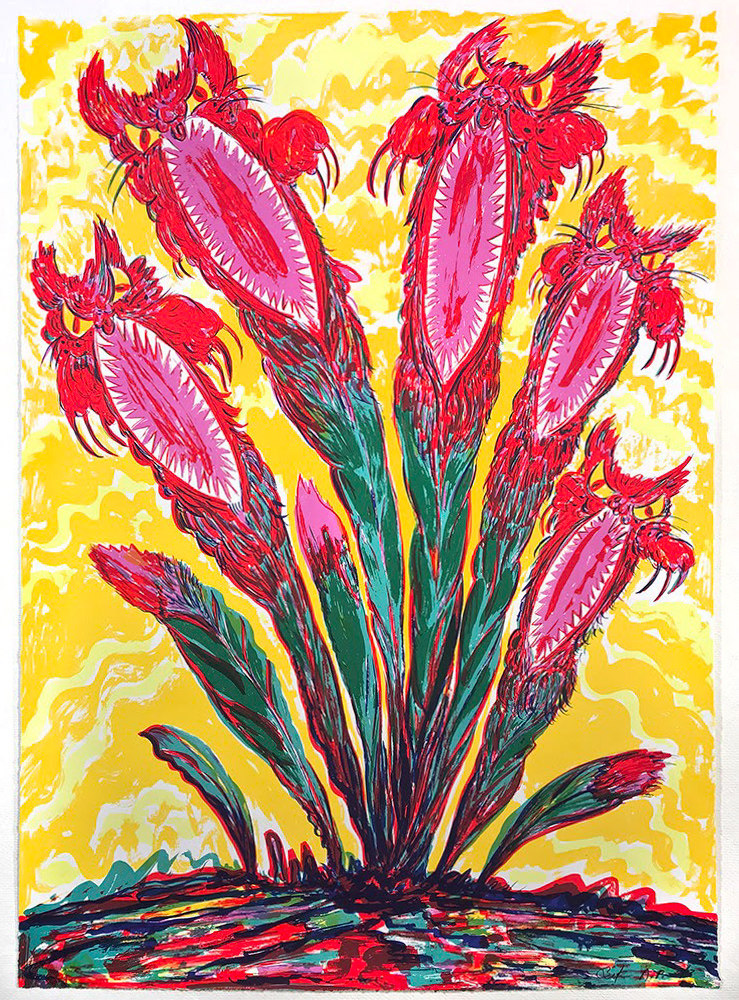 A screen print depicting a cluster of green plant stalks topped with the heads and paws of screaming cats. These cats have angry yellow eyes. Their mouths are vertical ovals rimmed with jagged teeth. Their red and pink bodies stand out in contrast against a bright yellow sky.