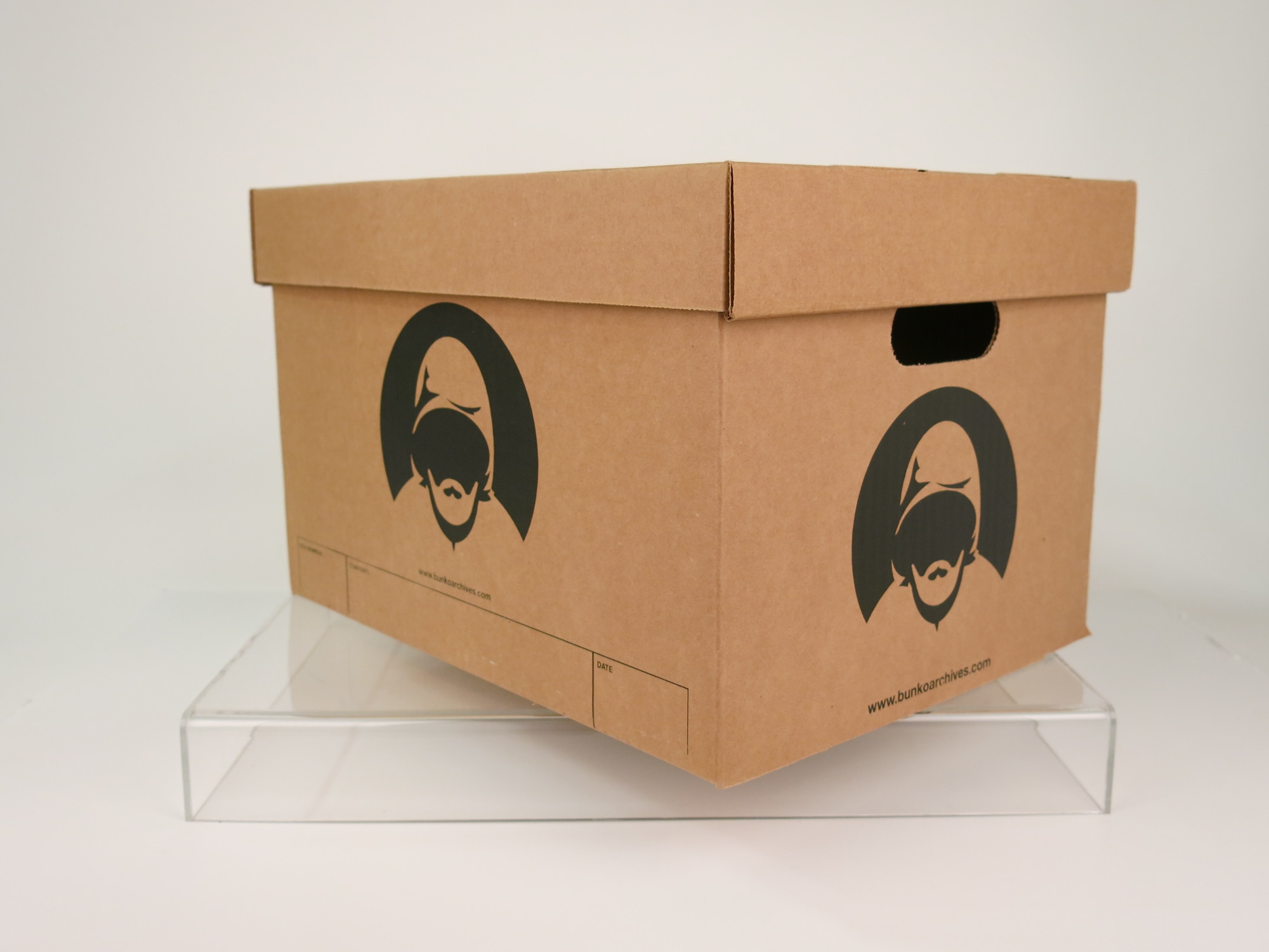 1.A cardboard banker’s box with the stylized illustration of the hooded, bearded man printed on the sides.