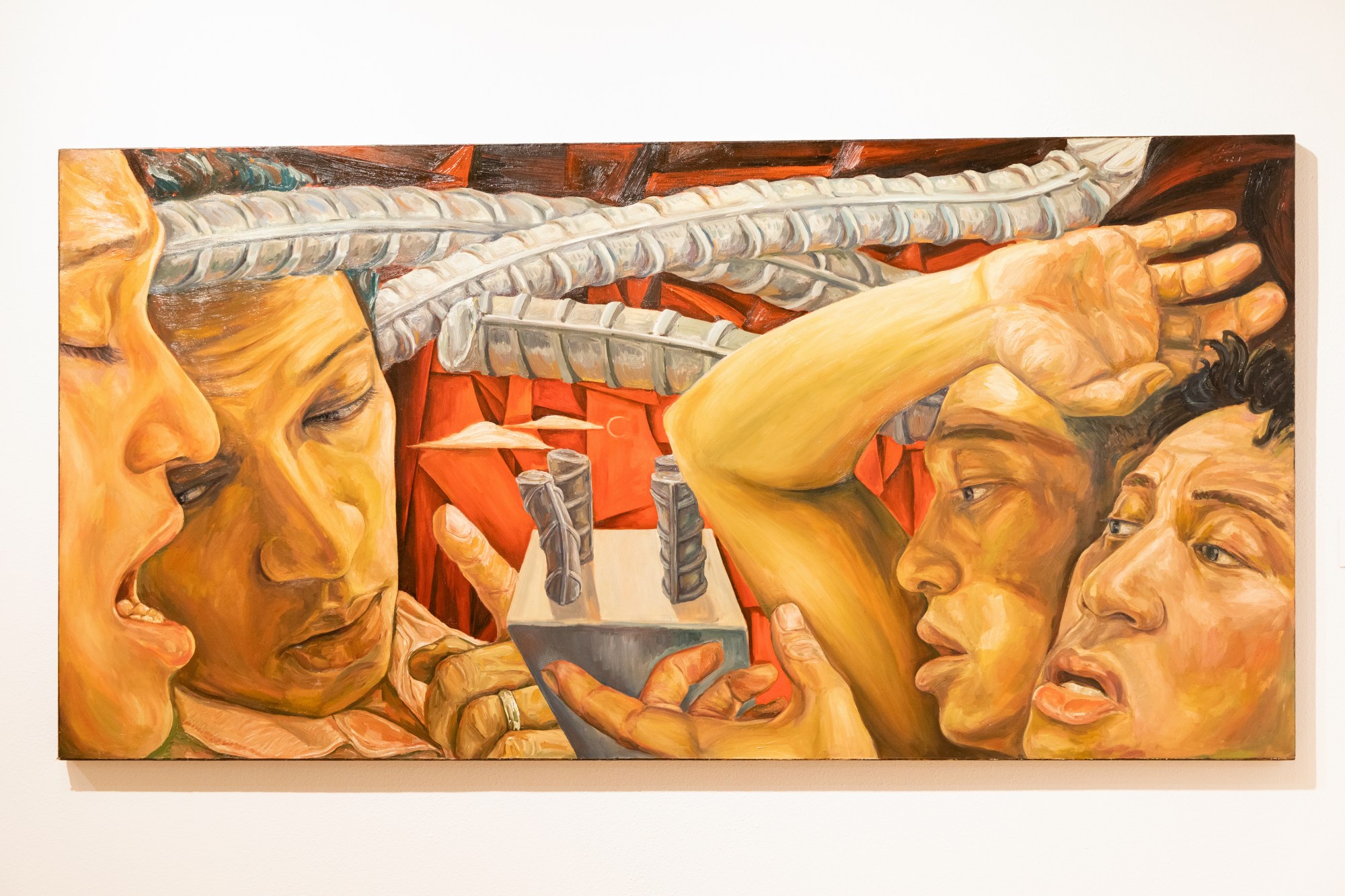 "This thing is me deciding if I should actually kill the art part of my life. At the time my feeling was, I'm going to make my grand exhit. this is what it's going to be. And everybody said the same thing: 'Why are you painting yourself now?'" The four self-portraits are "like me blaming myself for all the, sorry about the term, fuck-ups. And then you're always hesitating and then you're wasting your time and then you end up missing the boat." Why did he include the rebar? "I was working construction and I hated it." Architecture and building materials will reverberate through the rest of "Rebuilders."