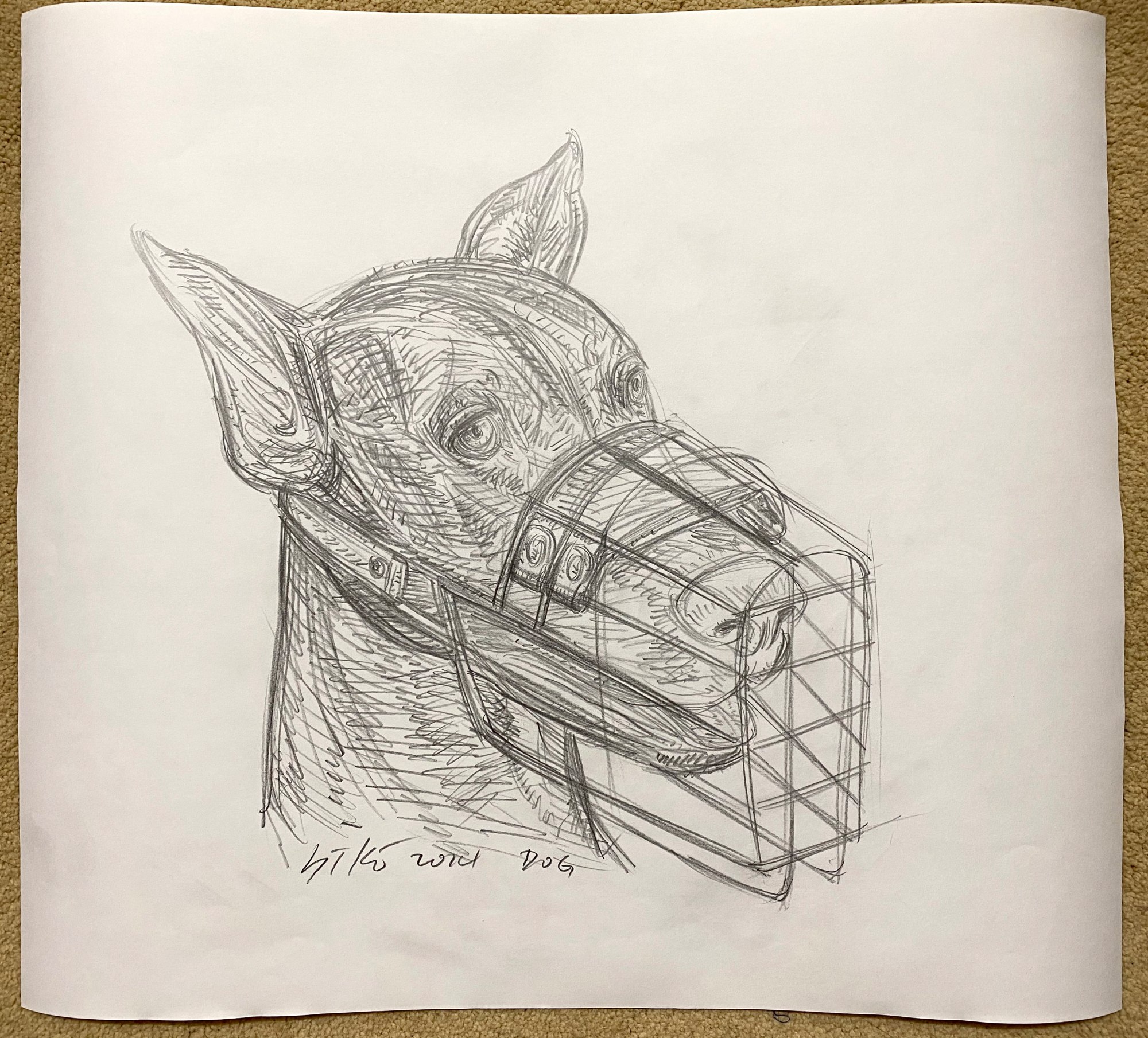 The muzzled dog embodies the artist’s experience of being ignored. “Nobody listens to me no matter how much I shout. But give me a chance to remove this and I’ll show you. You’re setting this artificial standard [for yourself] that people accept, maybe because it's easier. And because you’re afraid to get hurt. That’s what it is. The muzzle is the standard.”