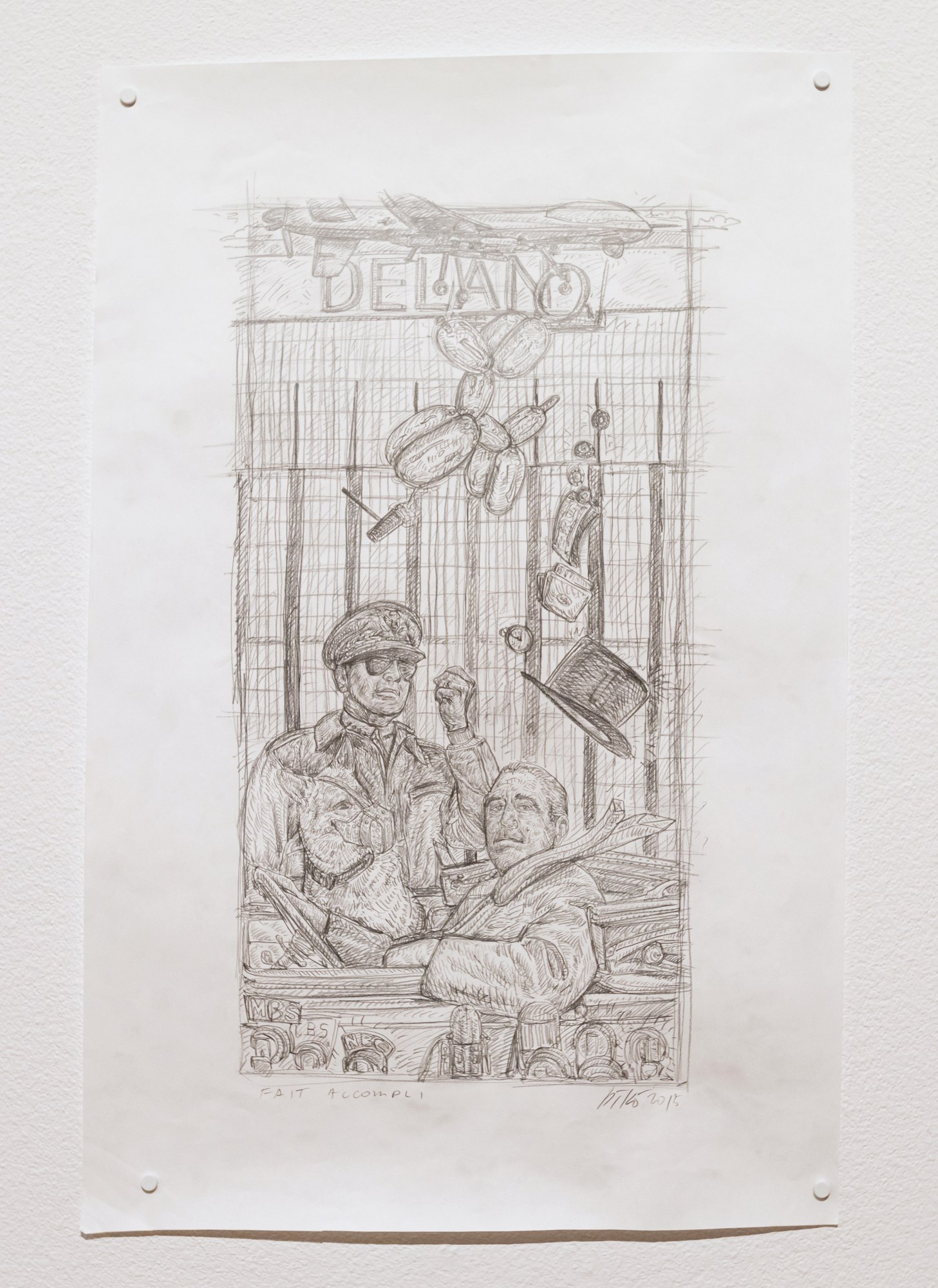 Here, the muzzled dog from "Requiem for the Outsiders" and "Breaking Armistice" is being ignored by a new form of authority, while Depio’s method of using blue-chip artists to represent aspects of the art world has moved on from the portrait of Damien Hirst in the bottom left corner of Armistice and manifested itself as one of Jeff Koons’ balloon dogs. (In Armistice, Hirst is every artist who schemes “to take over the world.”) Looking back, Depio sees that even the years he spent working construction have helped him become the artist he is today. “Art belongs to outsiders. You don’t belong to the mainstream. That just happens after the fact.”
