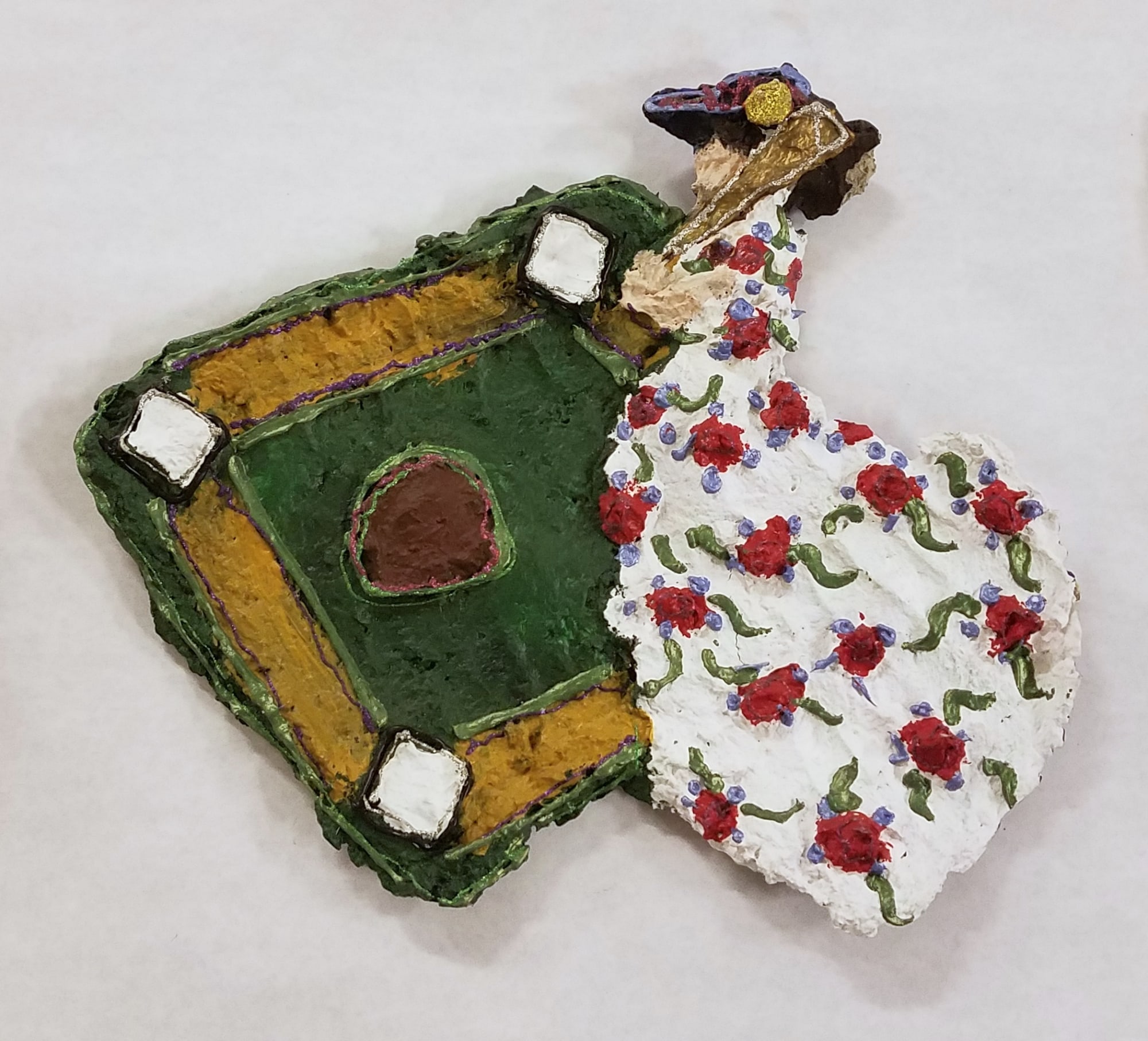 A flat, textured, pulp paper sculpture of a woman in a billowing dress decorated with roses preparing to swing a baseball bat.