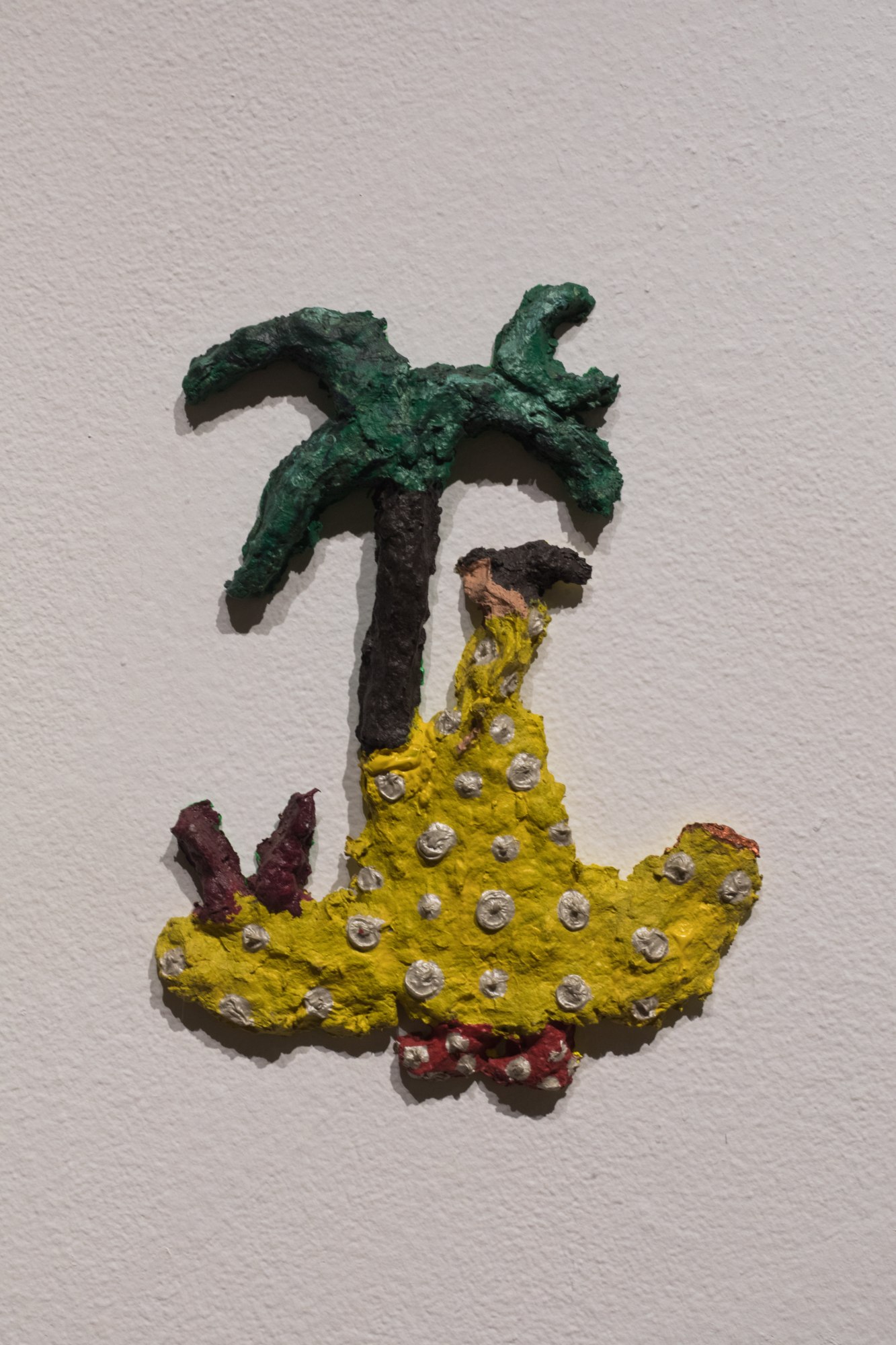A flat, textured, pulp paper figure of a woman in a billowing dress decorated with silver circles standing beneath a palm tree.