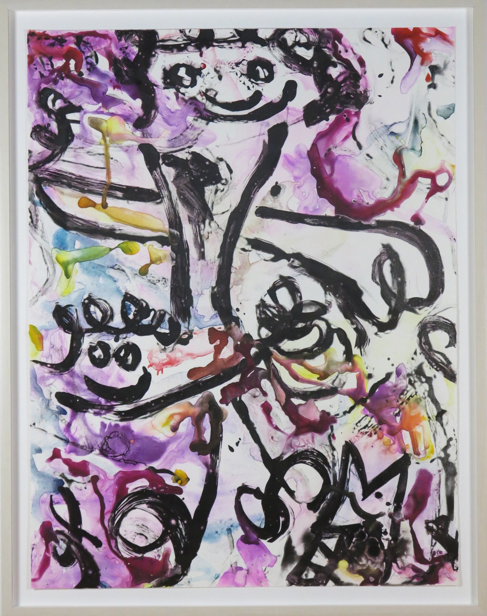 A painting of a standing figure surrounded by smears of color. The figure is sketched roughly, as if it has been drawn by a child, with suggestions of other faces scribbled around its legs. The figure and the scribbled faces are all smiling widely.