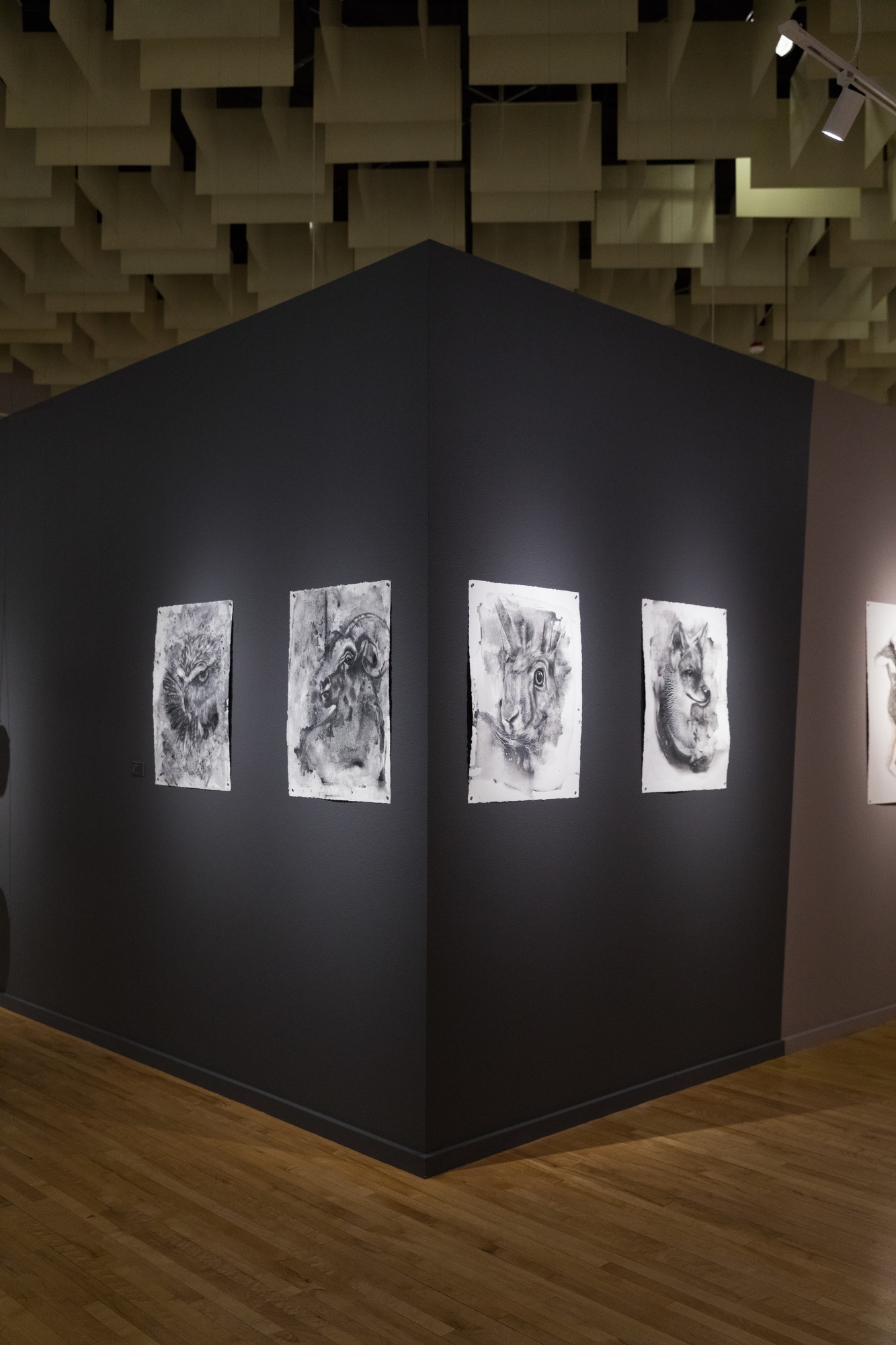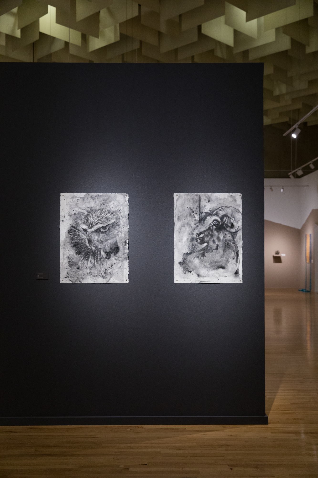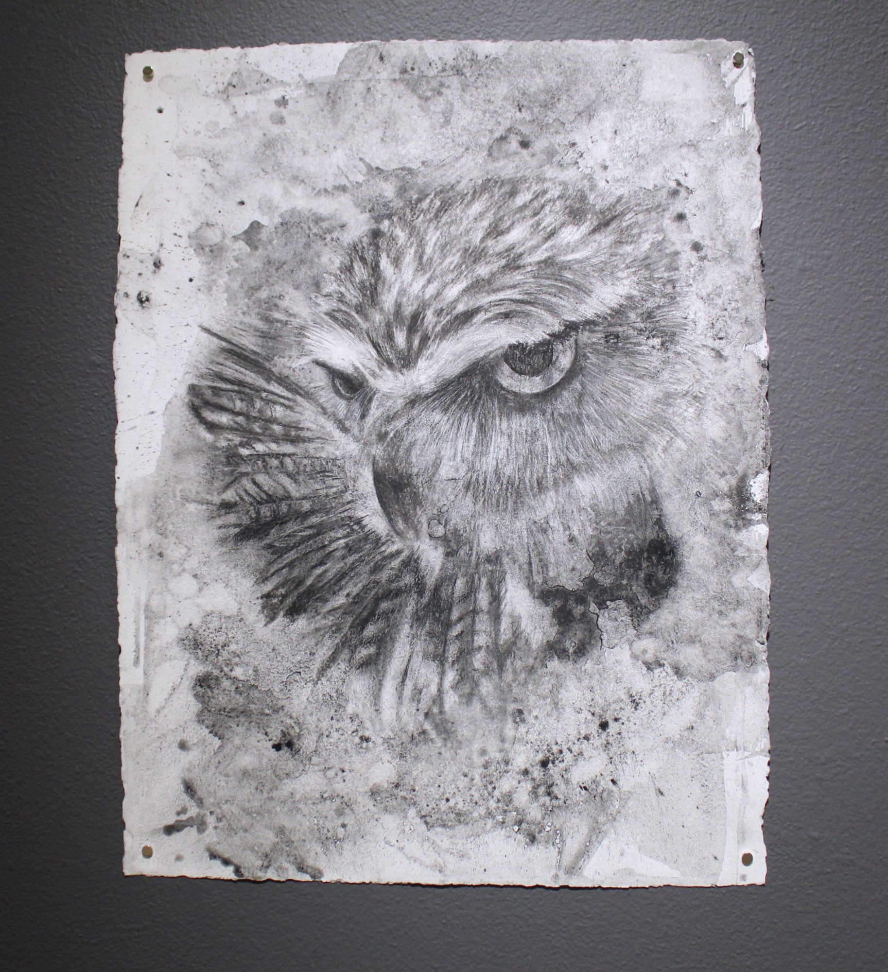 Image description: A realistic charcoal drawing of an owl’s face surrounded by liquid swirls and blots in various shades of gray. The bird’s head is turned to the left of the image with its large open eyes visible to the viewer. The feathers under the mouth are darker gray than the rest of the face (written by Andrea Noonoo).