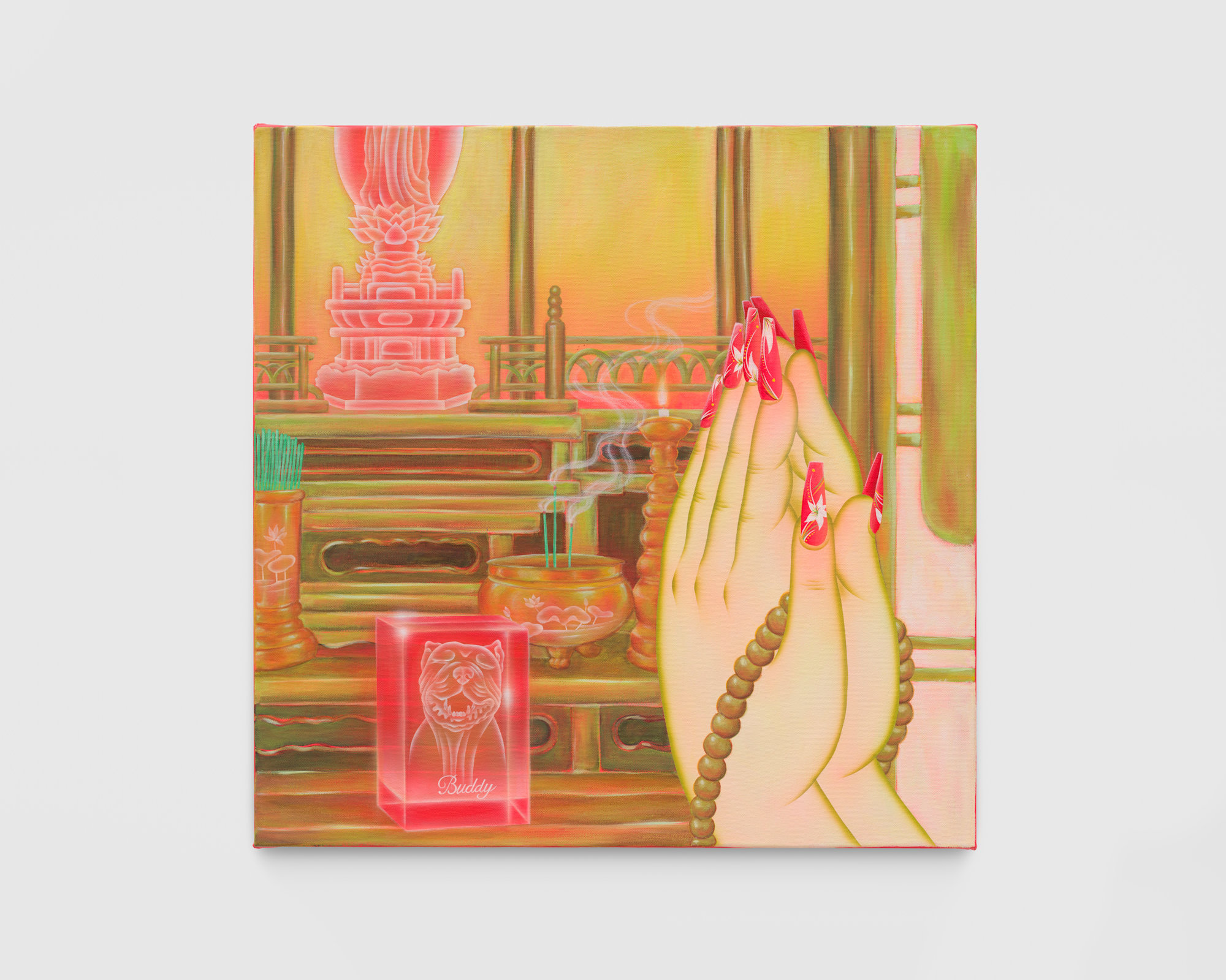 Growing up biracial, she attended school in both California’s Bay Area and Kanazawa in western Japan. In her paintings she reimagines Japanese spirit beings as contemporary women who wear up-to-date nail art on elegant fingers inspired by ukiyo-e imagery from the Edo period. Cultural migration takes on a physical shape. Can the spirits migrate, just like people? Or do they only stay in Japanese homes? The question is heightened by the knowledge that these spirits are traditionally formed by the accumulated energy of families living in a single place for years.