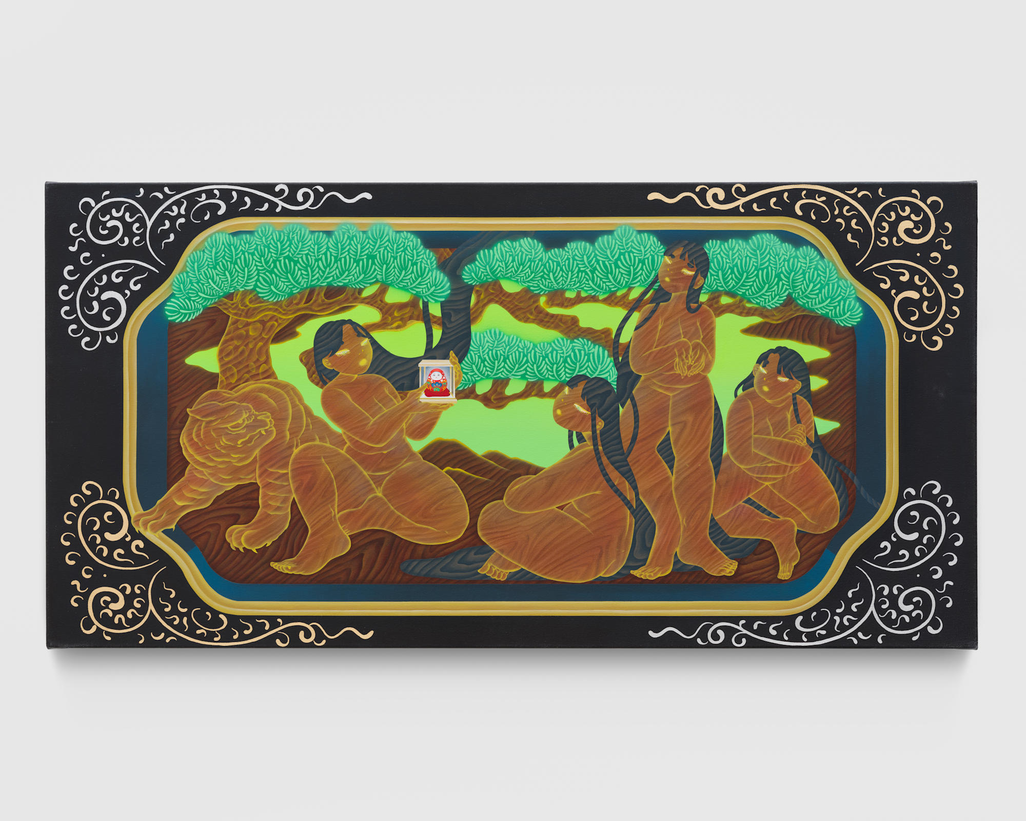 Growing up biracial, she attended school in both California’s Bay Area and Kanazawa in western Japan. Double Belonging is inspired by fragments of the wooden Buddhist altar that she brought from her late grandmother’s house in Kanazawa to her home in the United States. By replacing the original picture of Buddhist monks with a group of her women holding up a Kaga Hachiman Okiagari—a figure from Japan’s other official religion, Shintoism—Fuji shows us that a whole, complete form can be made up of things that espouse doubleness, and that have “shifted and morphed.” Cultural migration takes on a physical shape. Can the spirits migrate, just like people? Or do they only stay in Japanese homes? The question is heightened by the knowledge that these spirits are traditionally formed by the accumulated energy of families living in a single place for years.