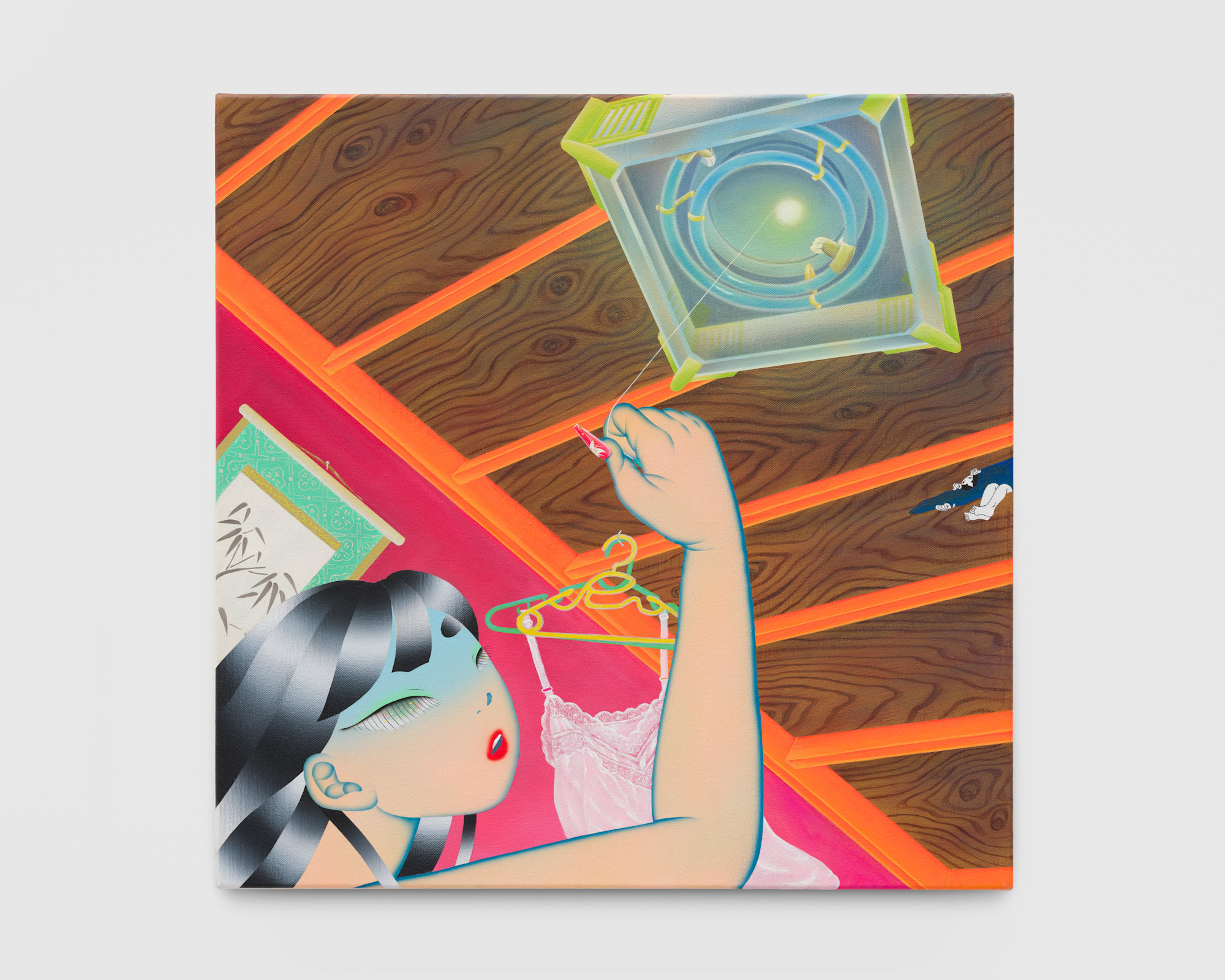 Growing up biracial, she attended school in both California’s Bay Area and Kanazawa in western Japan. In her paintings she reimagines Japanese spirit beings as contemporary women who wear up-to-date nail art on elegant fingers inspired by ukiyo-e imagery from the Edo period. Cultural migration takes on a physical shape. Can the spirits migrate, just like people? Or do they only stay in Japanese homes? The question is heightened by the knowledge that these spirits are traditionally formed by the accumulated energy of families living in a single place for years.