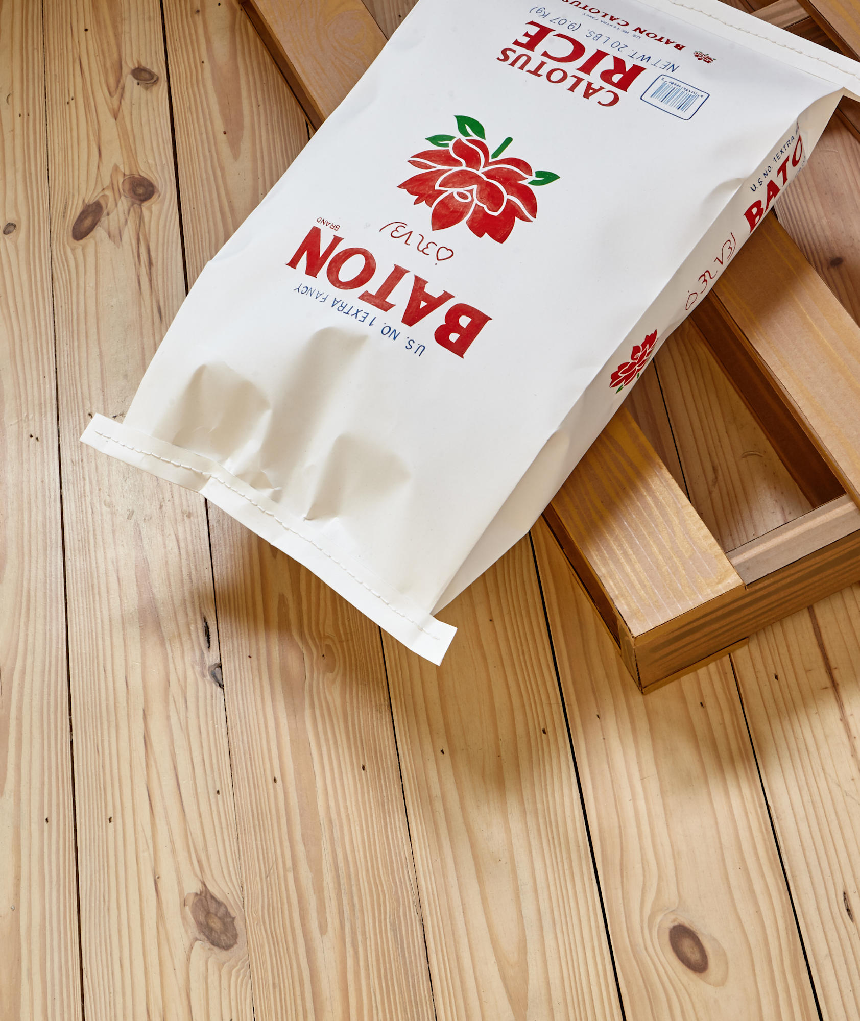 The presence of a shipping pallet clues us in to raft’s themes of international commerce and everything associated with it: colonialism, globalism, migration, consumerism, and cross-cultural exchange. The rice bags are modeled on the Calrose Botan brand that Mendoza–like many of her Filipino American peers–grew up with as a child in 1970s California. The artist has subtly altered them by changing the name to “Calotus,” with a lotus flower instead of a rose, and replacing “Botan” with “Baton,” to suggest both the passing of a baton and the Province of Bataan in the Philippines. The positions of the bags mirror the placement of key figures in the painting The Raft of the Medusa, by French painter Théodore Géricault (1791-1824). Like Mendoza, Géricault was processing some personal ideas about the effects of international cross-fertilization, as the Medusa in his title was the name of a French ship transporting passengers to the African colony of Senegal.