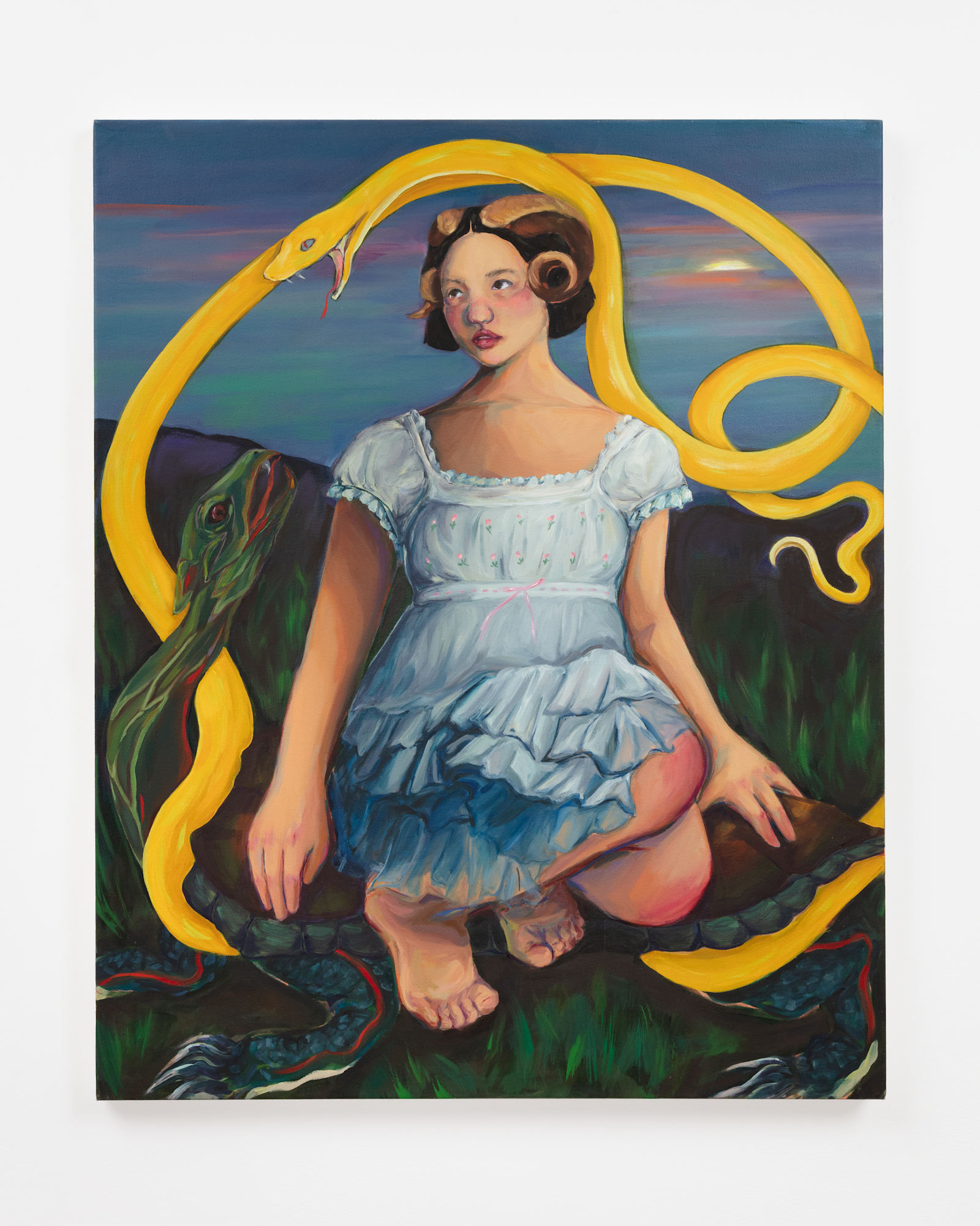 Growing up in an Evangelical Christian household, Daieny Chin felt a tension between their family’s religious beliefs and the indigenous Korean folktales and myths they heard from their mother. These paintings from their Mythos Unveiled series juxtapose those two ways of understanding the world. The mythology carries over into Tortoise and Snake, where the two animals encircle the figure of a girl with ram’s horns–a reference to the French artist Jean-Léon Gérôme’s 1853 painting, Tête de femme coiffée de cornes de bélier (Woman’s Head with Ram’s Horns), another work that blends mythology with then-contemporary life. “Rams are a symbol of sacrifice in Biblical context,” Chin explains.