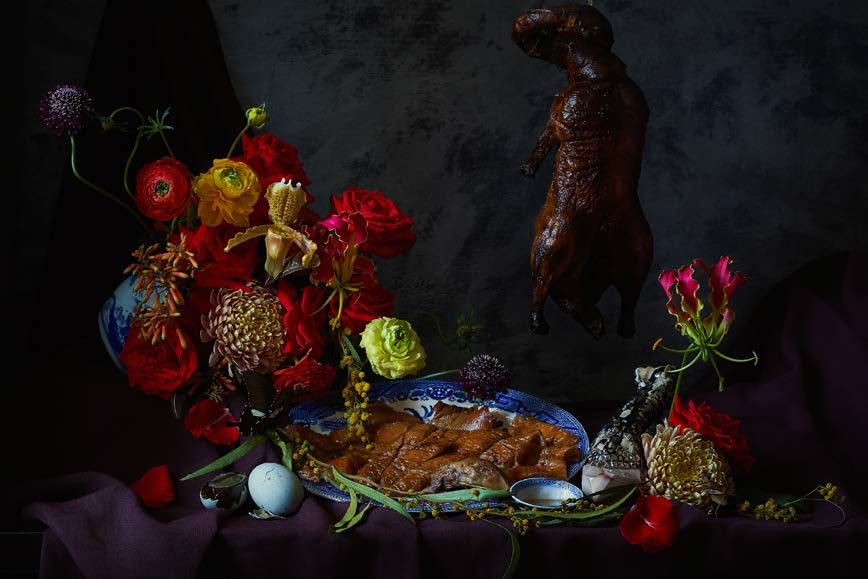 Ugly Duckling uses the visual conventions of European still lifes to present a Chinese celebratory meal of roast duck sourced from Californian restaurants. Stephanie Shih (史欣雲) makes a point of crediting them. “Cantonese roast duck from Sam Woo BBQ and peking duck from Moon House.”