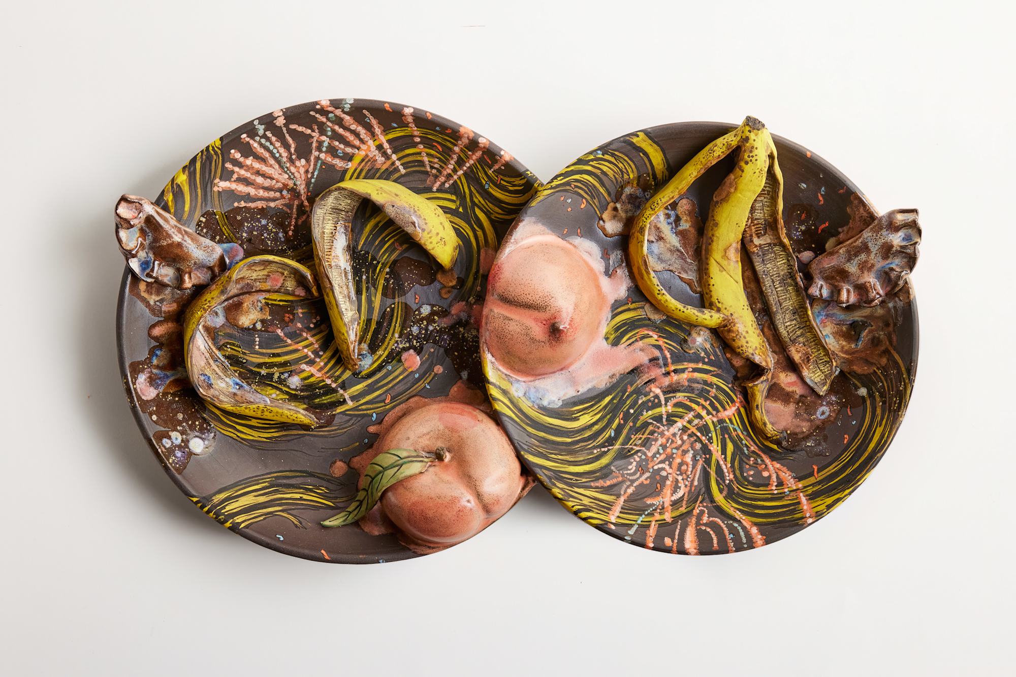 Peaches, dumplings, and banana peels are some of her recurring motifs. She values the way they hover between a multitude of contexts, making them simultaneously familiar and hard to pin down. In a 2022 interview with Guernica magazine, she said she cherishes art that leads to ambiguity, even misreadings. “For me, this misunderstanding is often the first step of understanding.” As a Korean who moved to the United States in her twenties, she knows that different audiences will see peaches as symbols of good luck (Korea), the state of Georgia (the U.S.), or maybe as comical sets of breasts and buttocks. Dumplings are a pan-cultural unifier, but viewers from different backgrounds will read them as “mandu,” (Korean) “gyoza,” (Japanese) or “pierogi” (Polish), all with different associations.