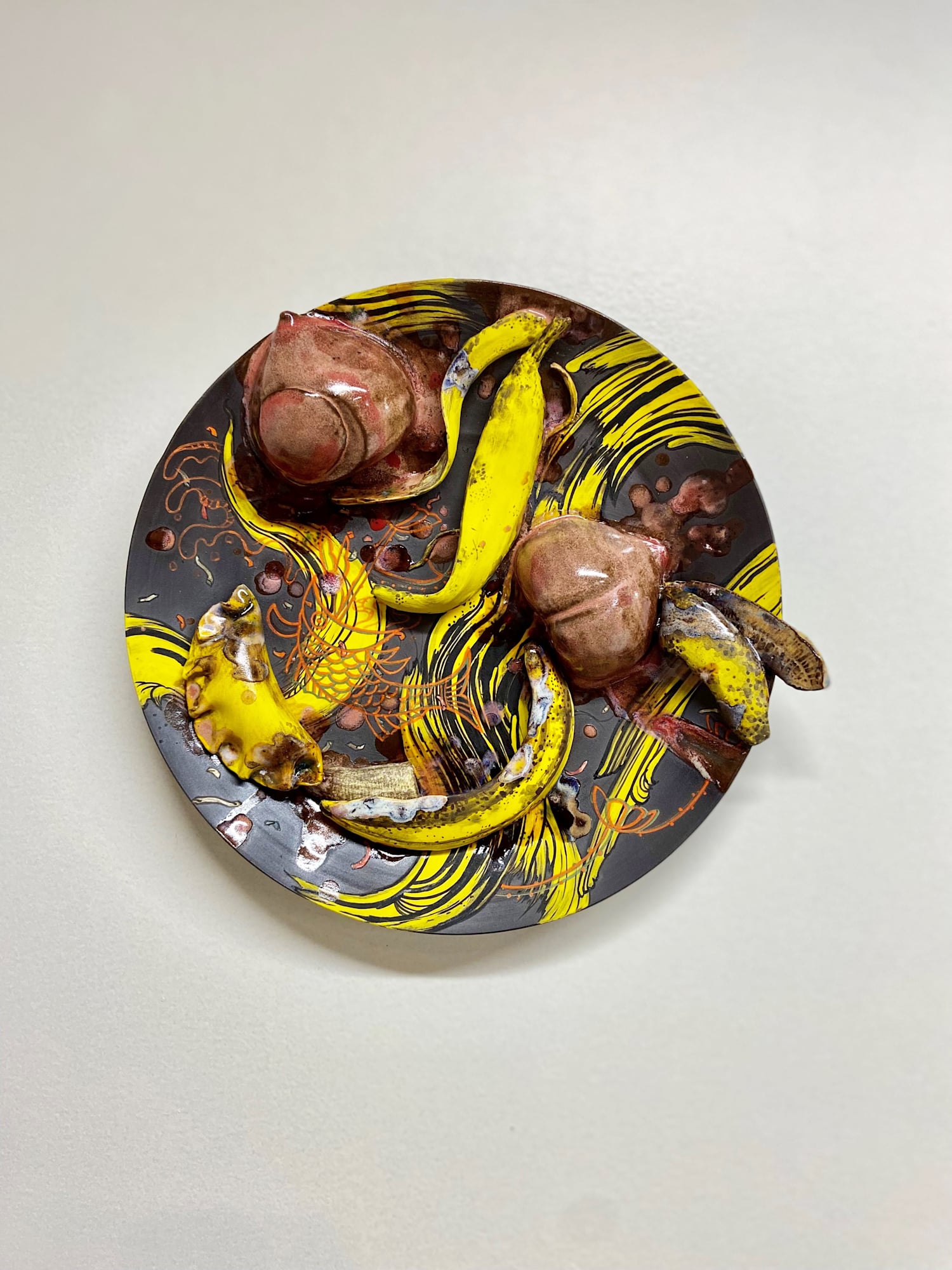 This ceramic is part of Jiha Moon’s Yellowave series. She uses the color yellow to convey a “social, political, or cultural point of view,” acknowledging its historical association with racial slurs directed at Asian Americans. By prominently and abundantly incorporating yellow in her work, she subverts these biases and reclaims it as a symbol of joy.