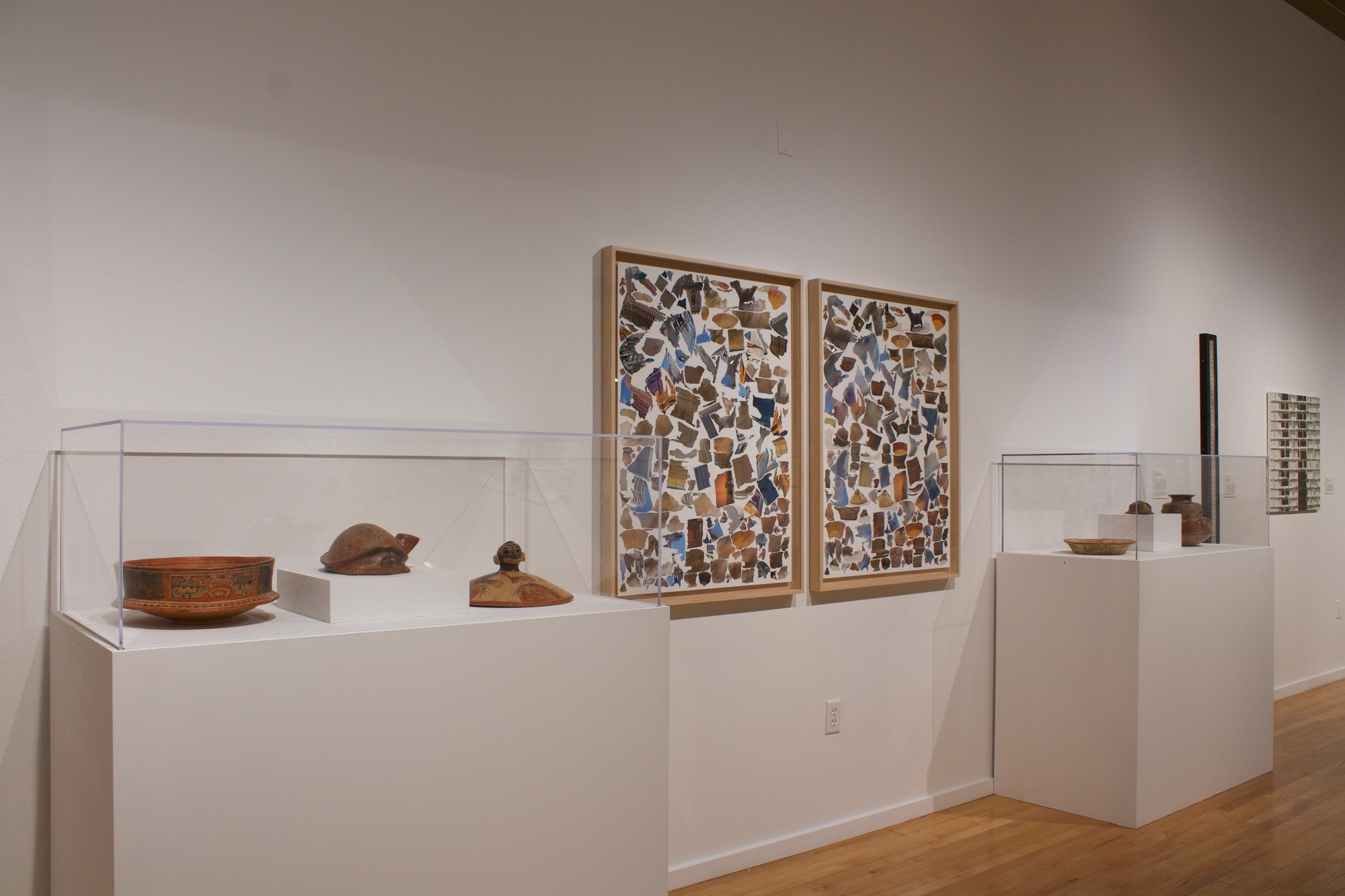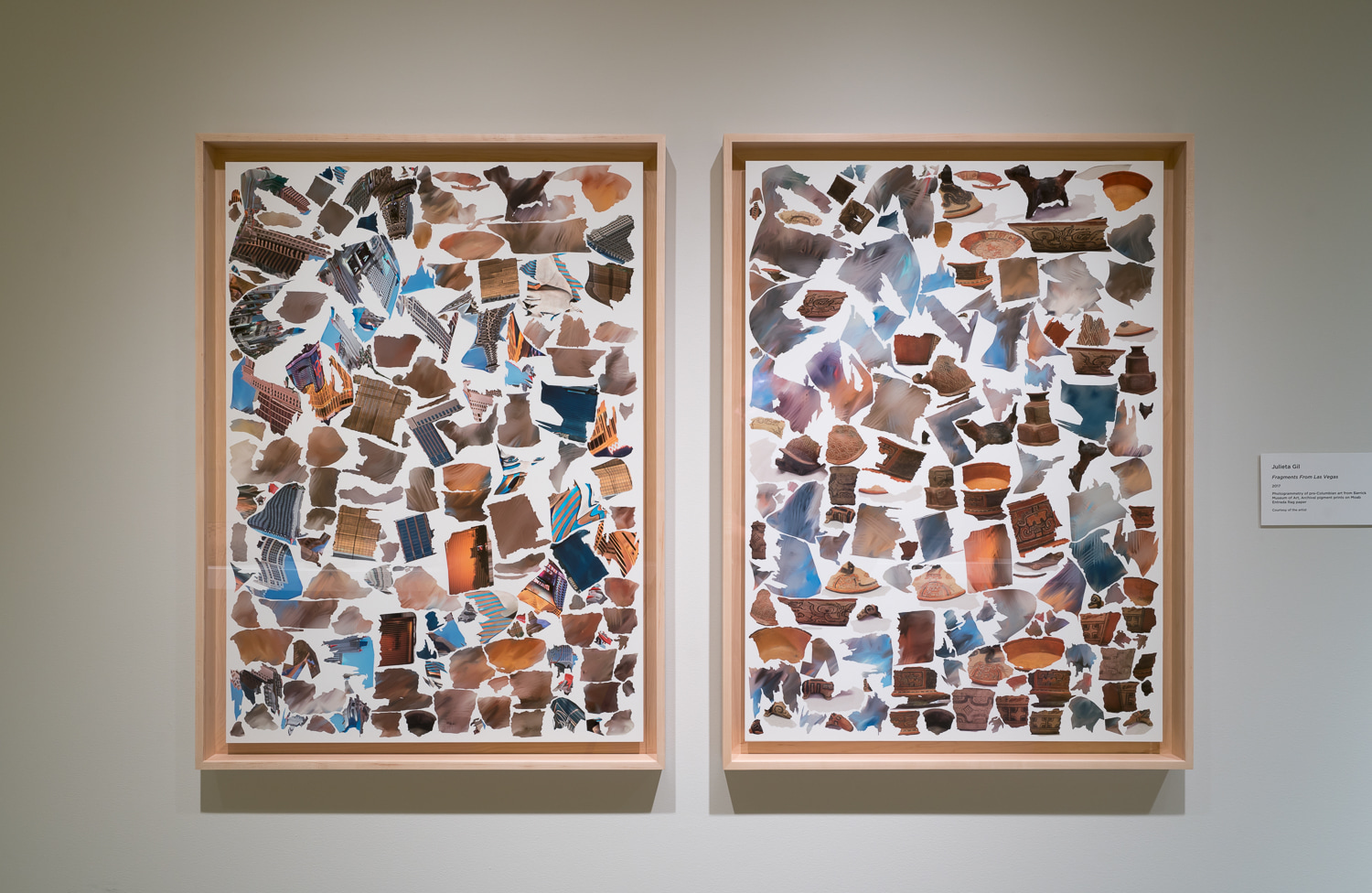 In 2017, Julieta Gil came to the Marjorie Barrick Museum of Art to create 3D scans of objects from the museum’s collection of Mesoamerican ceramics. In Fragments from Las Vegas she alters the scans and displays them next to pictures of casinos from the city where the Barrick is located. Both sets of images are associated with particular places and times. The casinos are immediately identifiable as contemporary tourist attractions, while the styles and materials of the Mesoamerican objects situate them in the distant past. By fitting them both into the same series of shapes, the artist suggests the existence of a third place, a digital world, where everything exists in the same time and space. This intersection of real and digital existences is the crux of Gil's practice. “Digital life,” she writes, “is as real as any other kind.” The ceramics on display are the same ones Gil used in her work. Fragments from Las Vegas was created for Unsettled, a group exhibition organized by the Nevada Museum of Art. Curated by JoAnn Northrup in consultation with Ed Ruscha, the exhibition traveled to the Anchorage Museum, Alaska, and the Palm Springs Art Museum, California. (DKS)