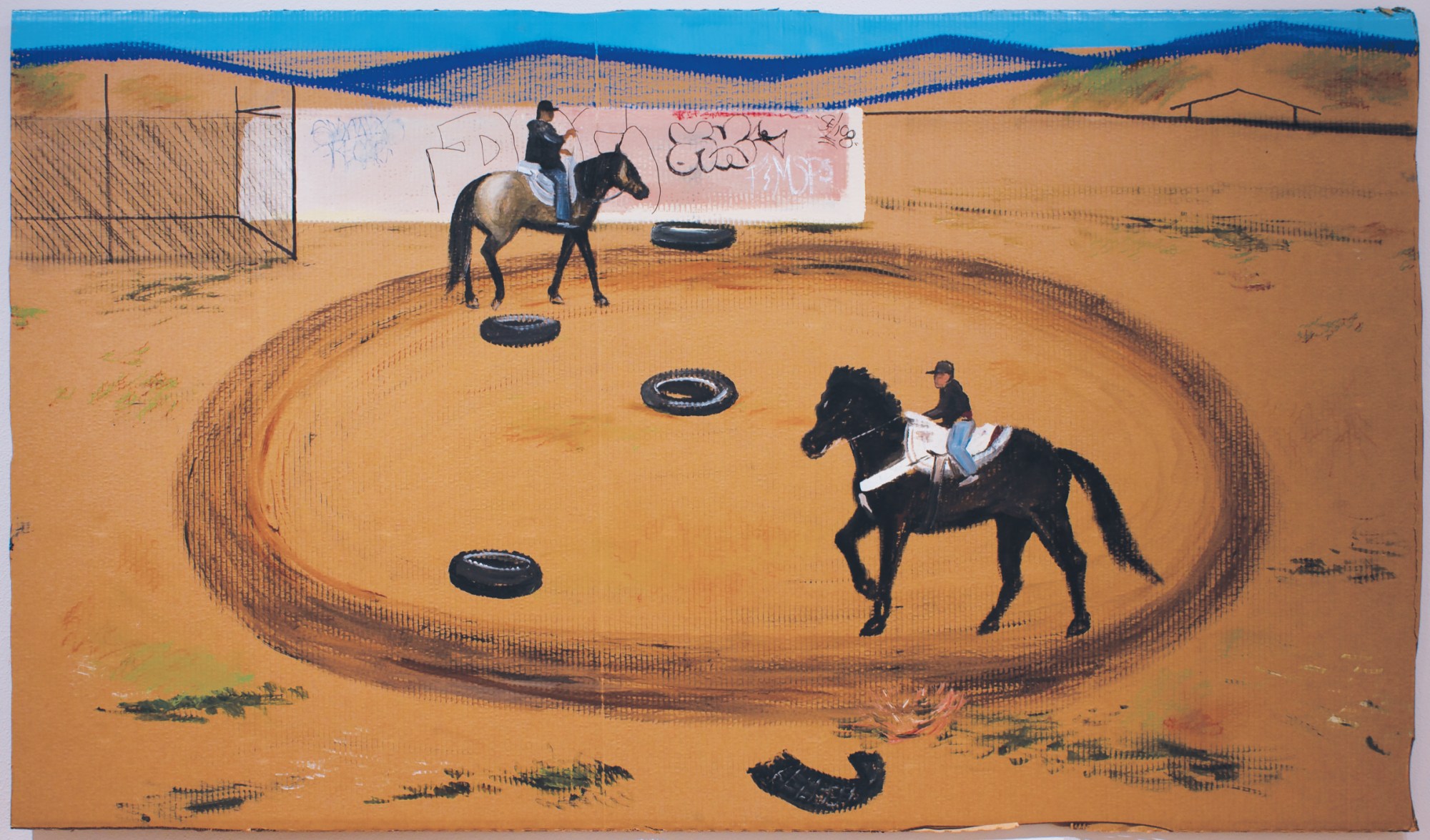 Item Description: A painting depicting two horse riders on a circular track in a bare, brown desert environment littered with tires. There is a wall covered with graffiti in the background behind one rider, and a black wire cage next to the wall. Hills in the distance are edged with dark blue under a light blue sky.