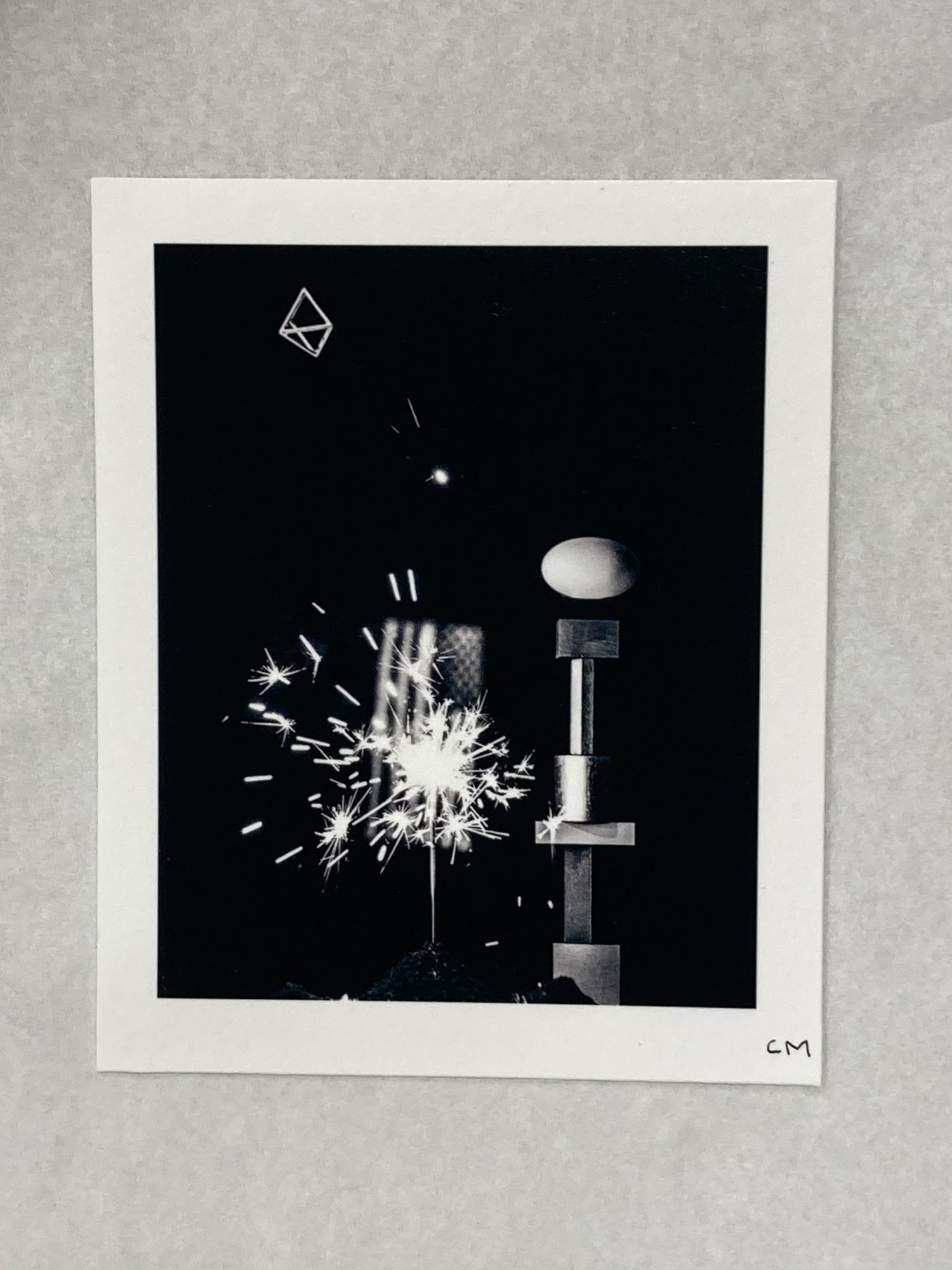 Item Description: A black and white photograph of a lit sparkler jetting out sparks with a small American flag behind it. A pyramid-shaped prism hangs in the black sky above the sparkler and the flag. There is a vertical geometric structure on the right made of squares, cylinders, and rectangles with a light-colored oval floating on top of it.