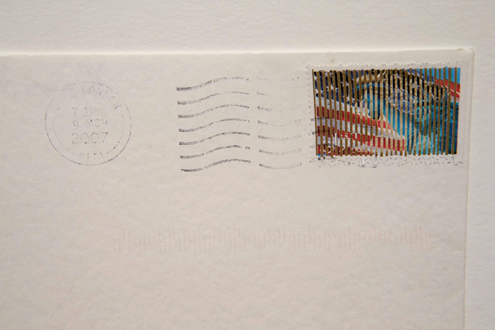 Item Description: A framed legal-sized envelope with a Los Angeles postmark dated June 1, 2007. The form of the stamp in the upper corner of the envelope is composed of two different stamps that have been cut into tiny vertical strips and reassembled so that a picture of the US flag alternates with the face of Queen Elizabeth II. (written by Andrea Noonoo)