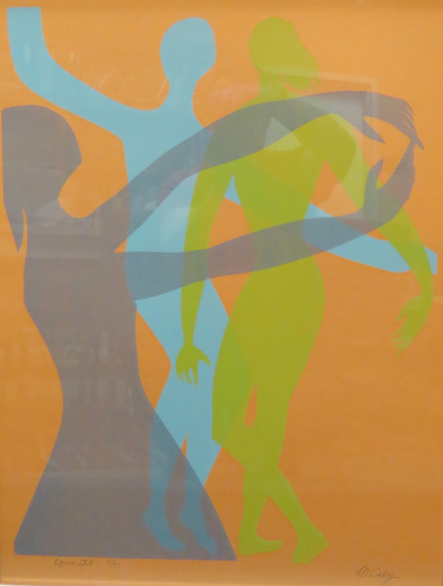 A print depicting three stylized human figures against an orange background. All of the figures are holding their outstretched arms in graceful positions. They are superimposed over one another, with each one a different color. The one in the foreground is gray, the one behind it is lime green, and the third one at the back is blue. The artist’s signature is handwritten on the lower right.