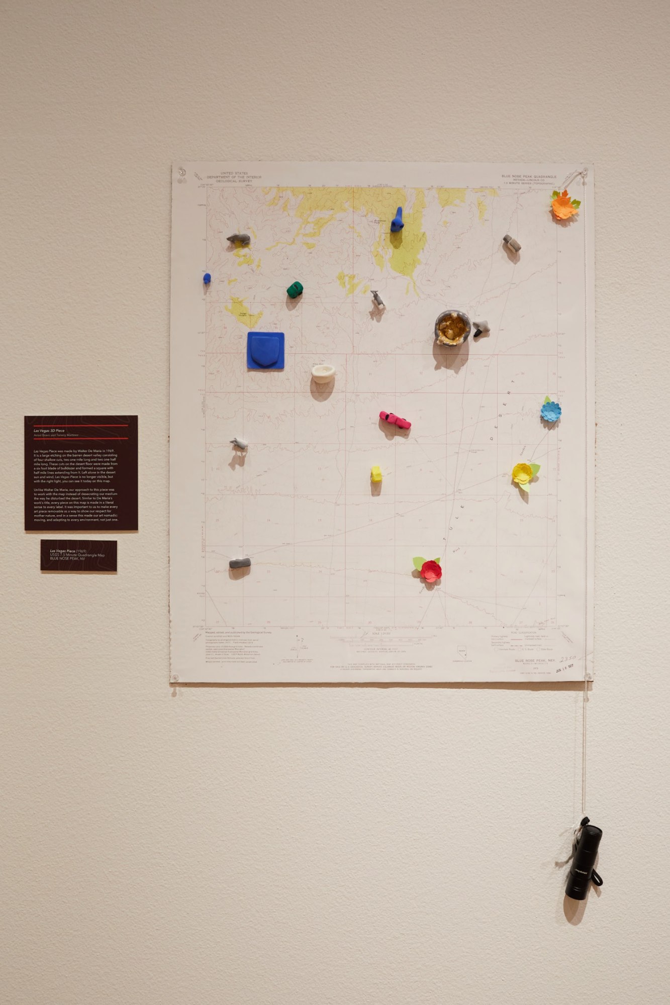 Unlike Walter De Maria, our approach to this piece was to work with the map instead of desecrating our medium the way he disturbed the desert. Similar to De Maria's work's title, every piece on this map is made in a literal sense to every label. It was important to us to make every art piece removable as a way to show our respect for mother nature, and in a sense this made our art nomadic: moving, and adopting to every environment, not just one.