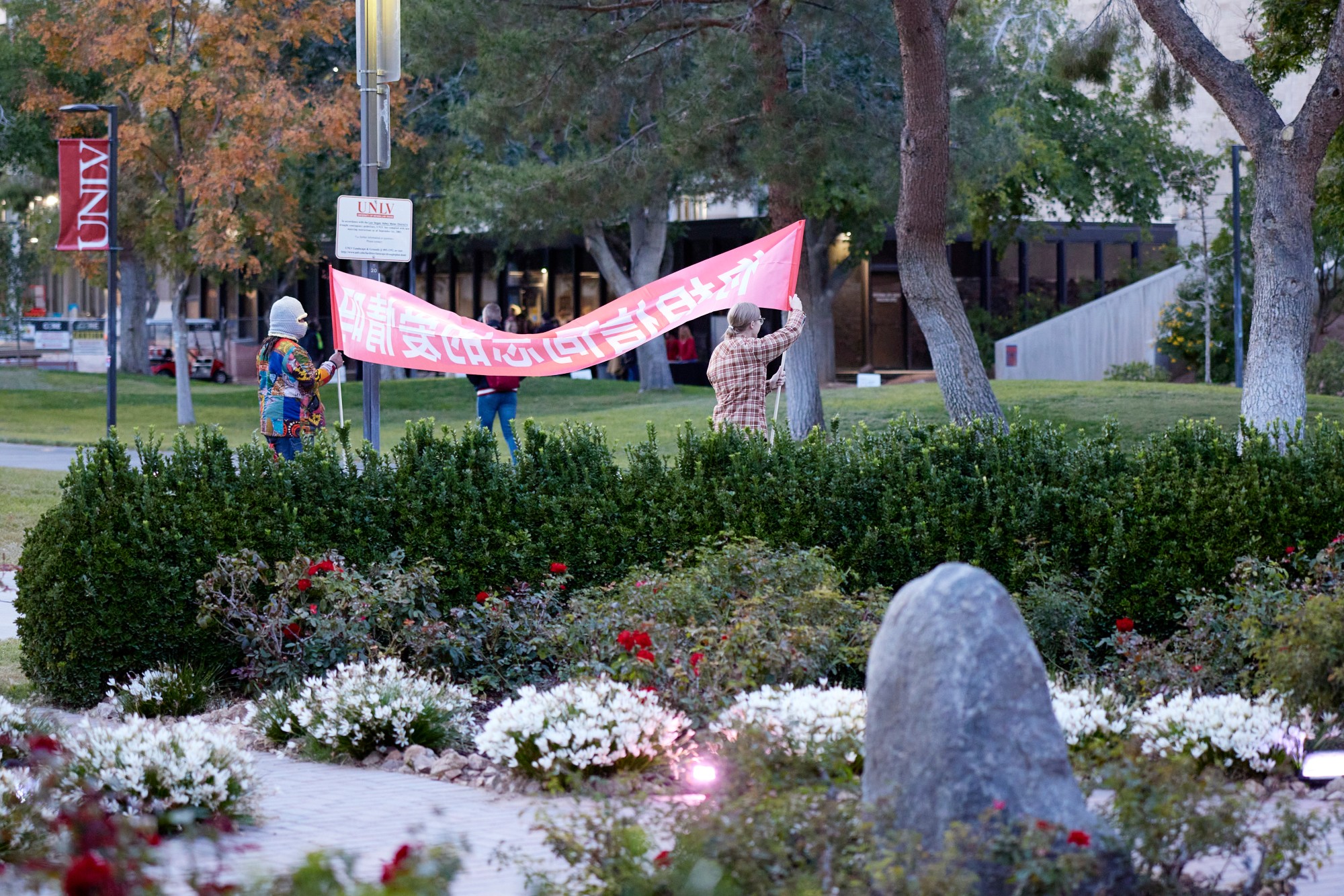 The usage of Mandarin characters on the banners renders these works illegible to many outside of China and Southeast Asia. Amidst this global pandemic, and the fear mongering that the 45th President of the United States aggressively encouraged toward China, positing these indecipherable statements in public space asks us to question other types of fear and bias that we have for bodies and publics.