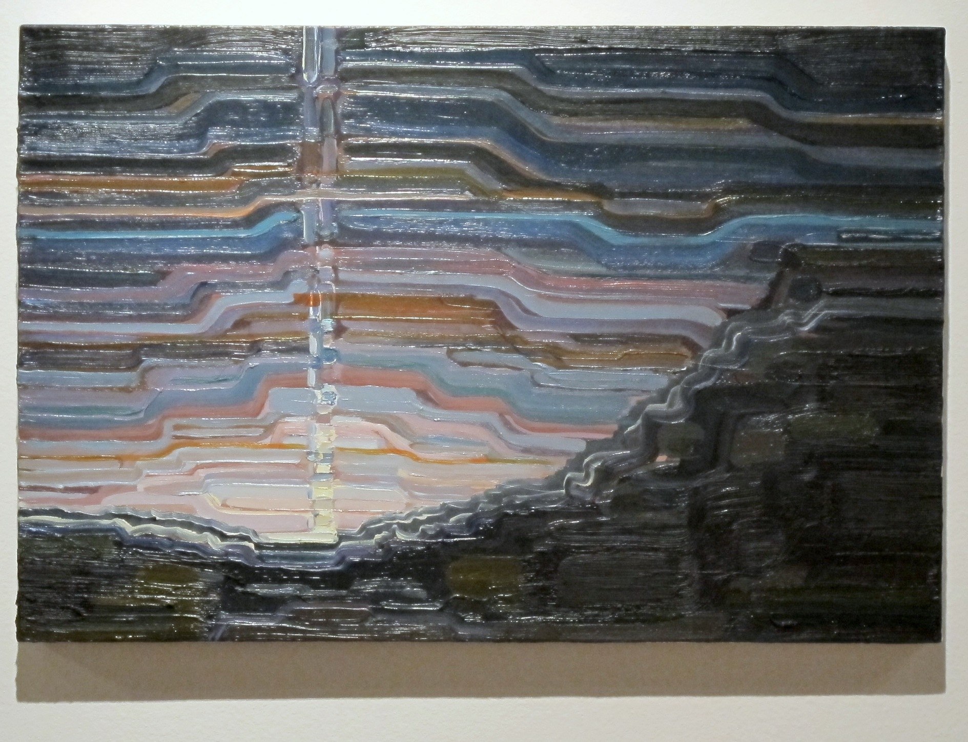 A painting of a colorful sky above a rocky landscape. Thick, wavy, dark blue and brown lines at the top gradually lighten to become pale pinks, oranges, and blues in the middle of the painting. On the right side stands an outcrop with a step-like quality. Almost all of the brushstrokes in this painting are roughly horizontal aside from a line of vertical strokes, just left of center, running upwards through the sky.