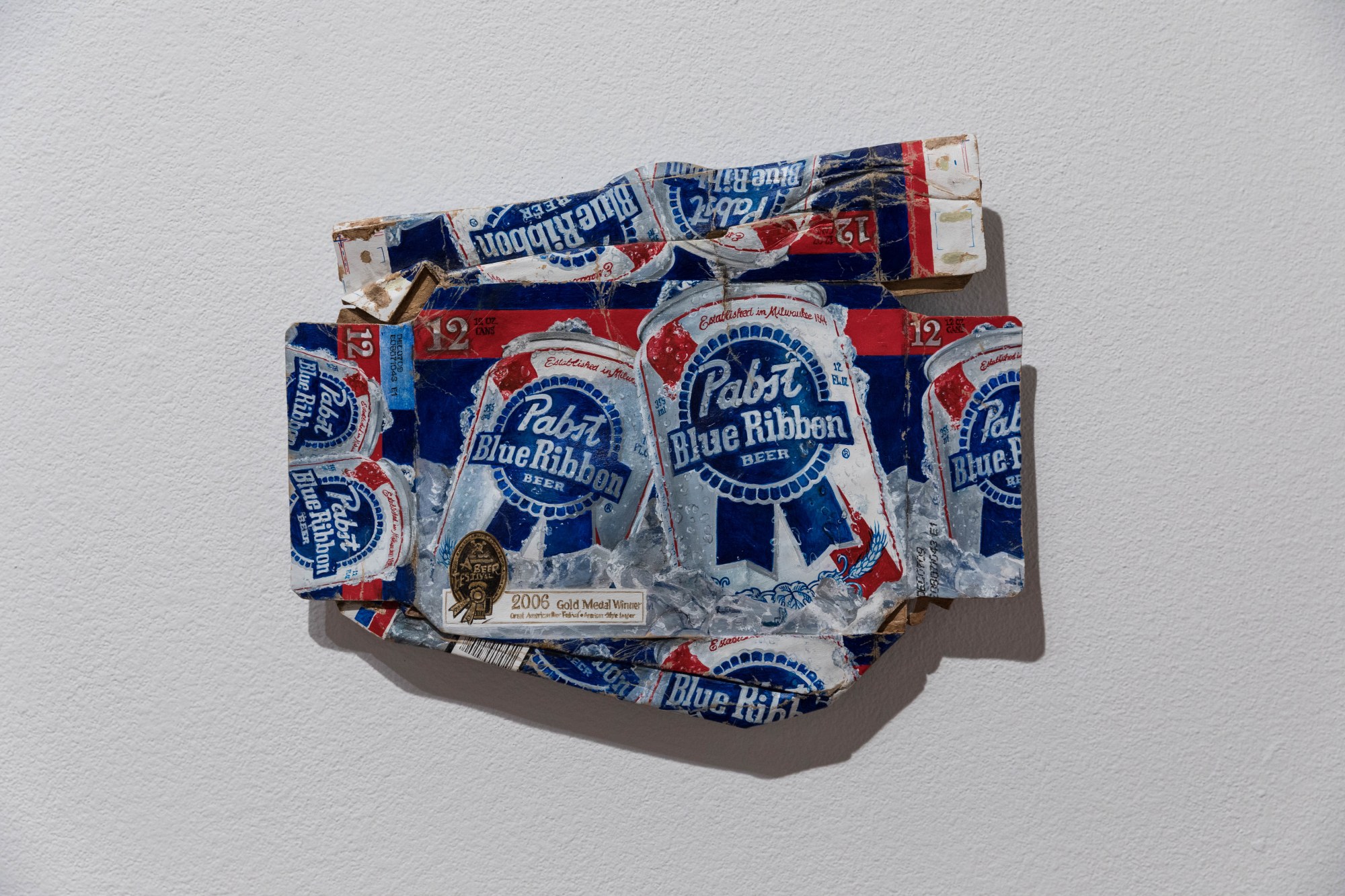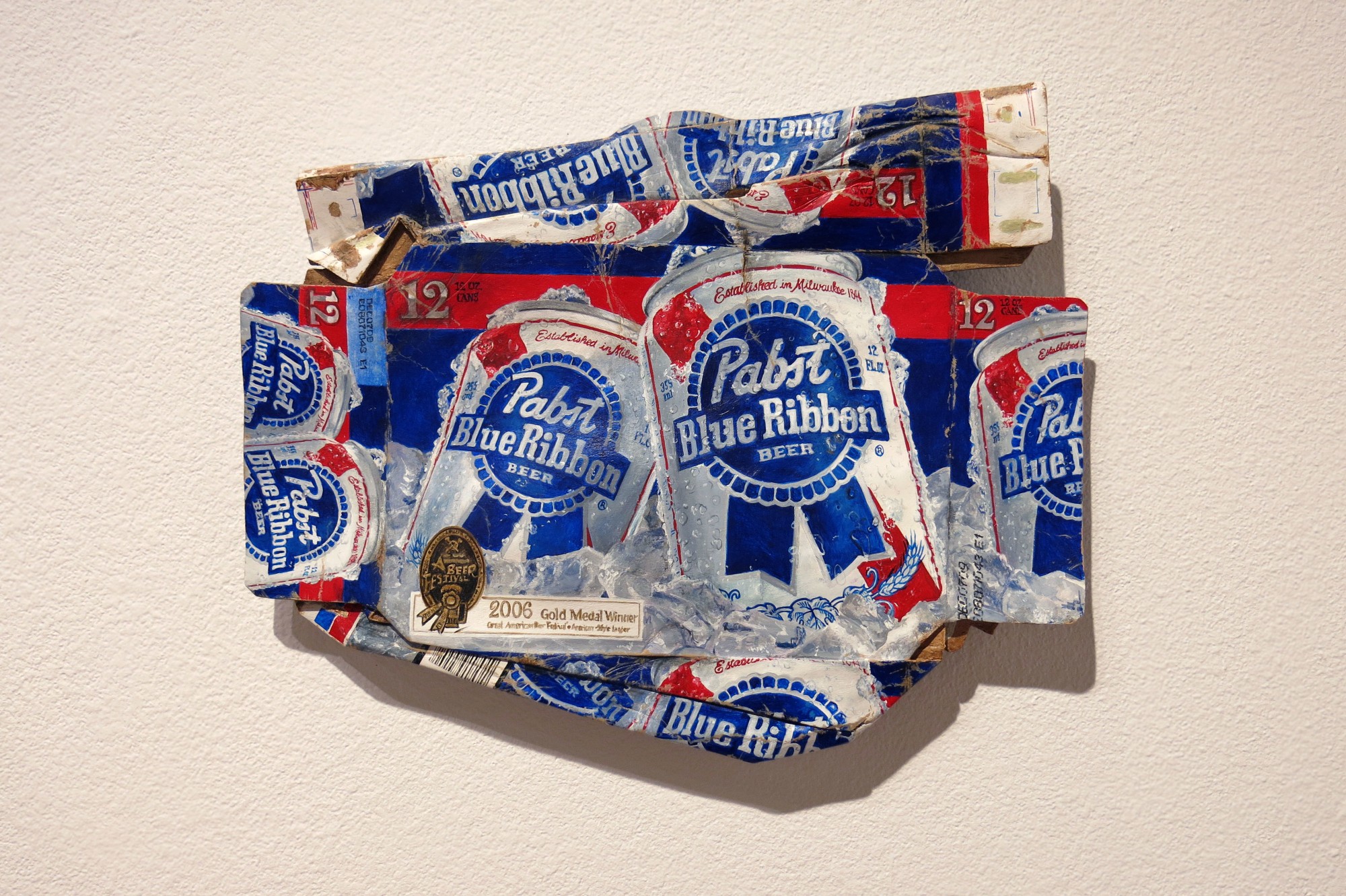 Item Description: A wall sculpture that resembles a flattened and crushed cardboard box. The front of the ‘box’ is decorated with an illustration of two white beer cans labeled “Pabst Blue Ribbon.” Pictures of similar cans appear on the top, bottom, and sides of the box.
