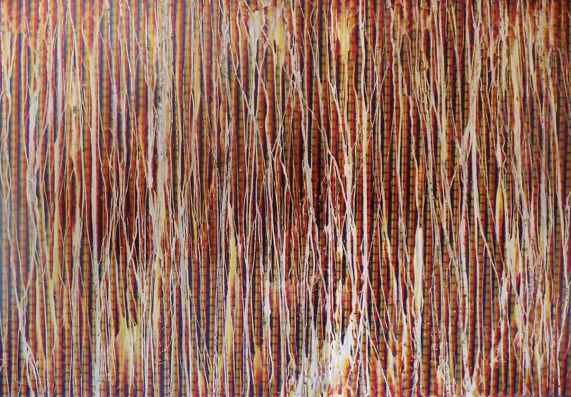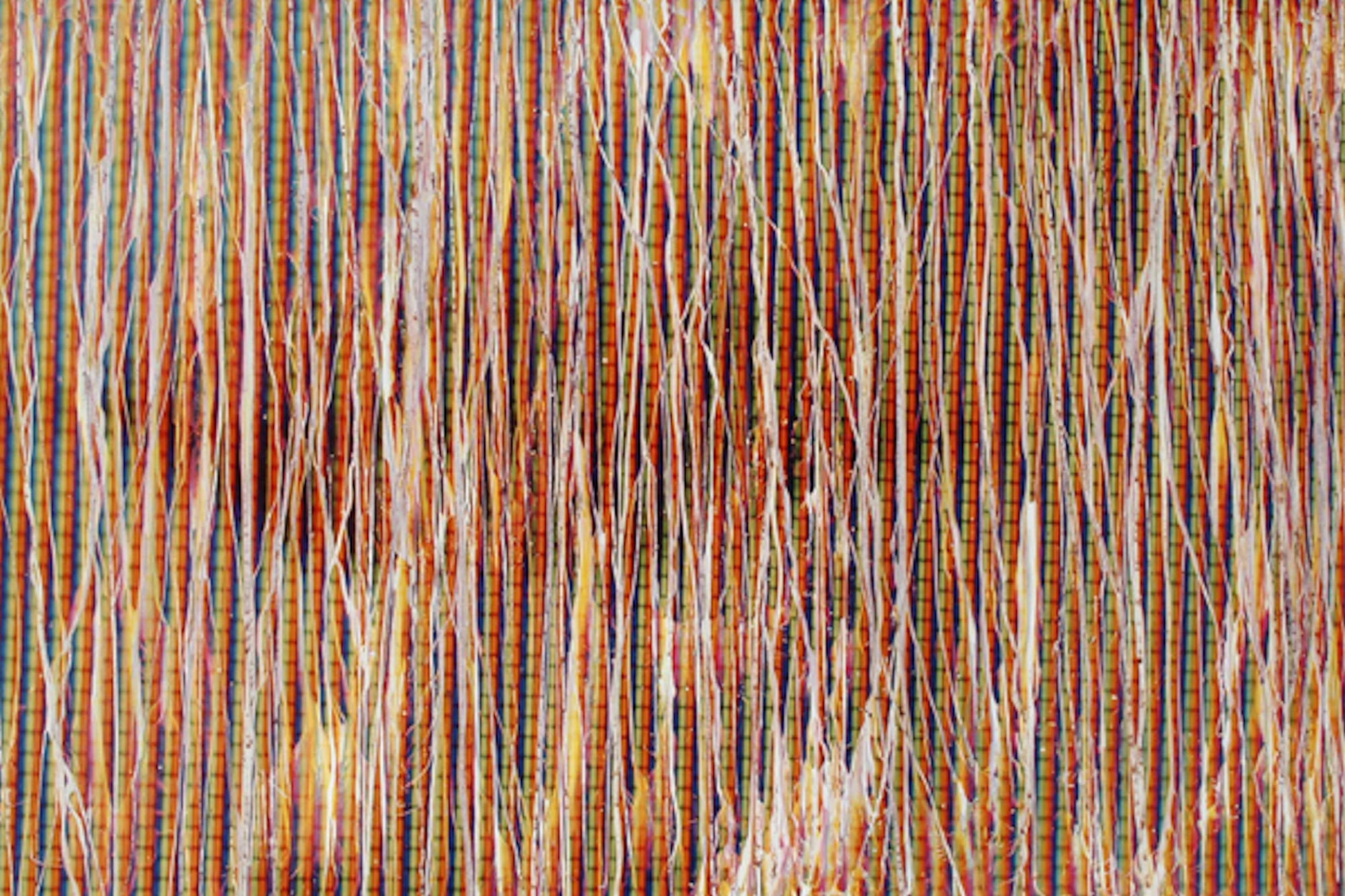 An abstract image composed of wavy vertical lines of various colors. Thin, white streaks stream down across the surface, branching and coming together like raindrops running down a window. Besides these white streaks, the majority of the lines are red or yellow.