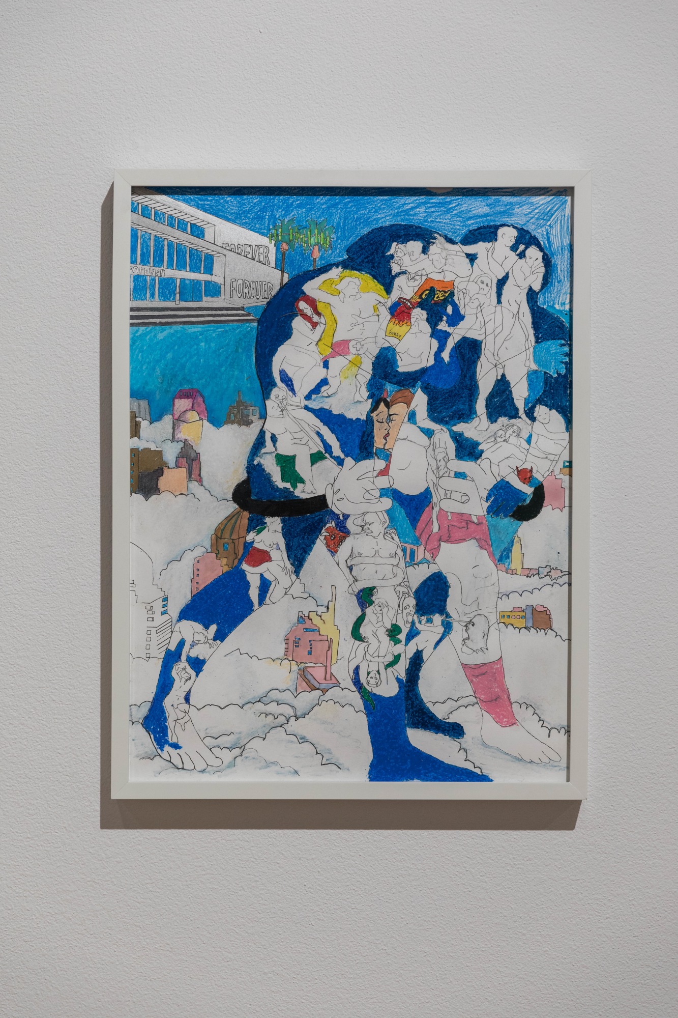 A framed drawing of a couple in silhouette walking across the field of clouds. The faces of Disney’s Snow White and her prince can be seen kissing in the gap between the two figures. Their bodies are covered with overlapping drawings of much smaller people engaged in dramatic action - gesturing fiercely, holding one another, and so on. All of these figures may be familiar from various classical paintings, most prominently Michelangelo’s Last Judgment. The word “Forever” is written on a pair of buildings that hover in the sky above the cloud field.