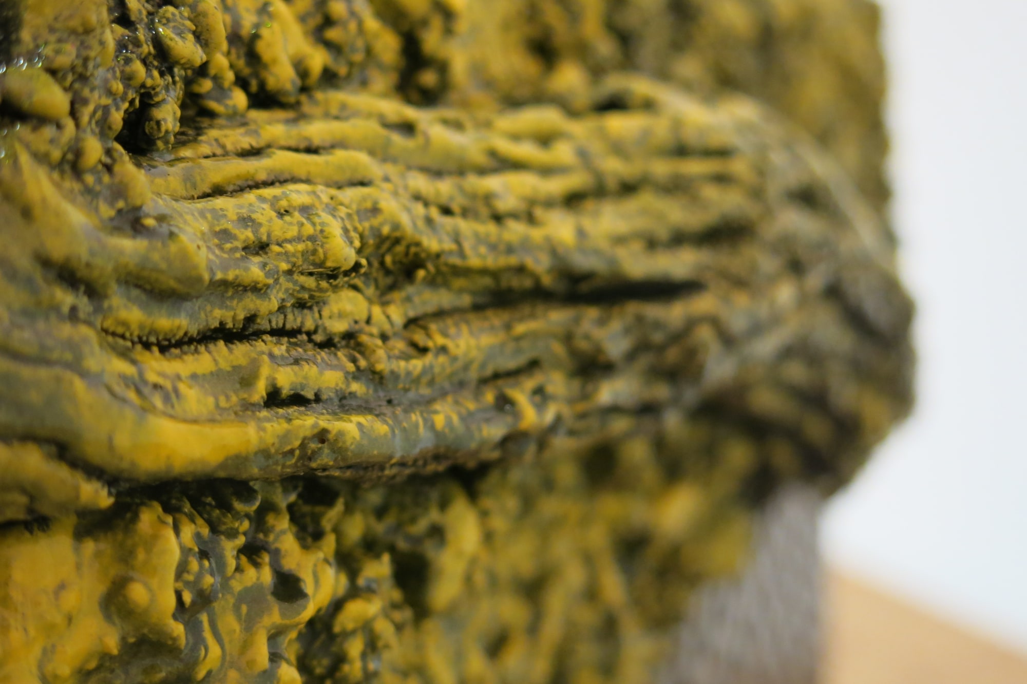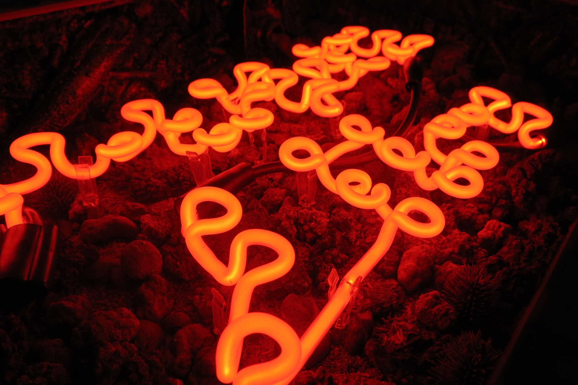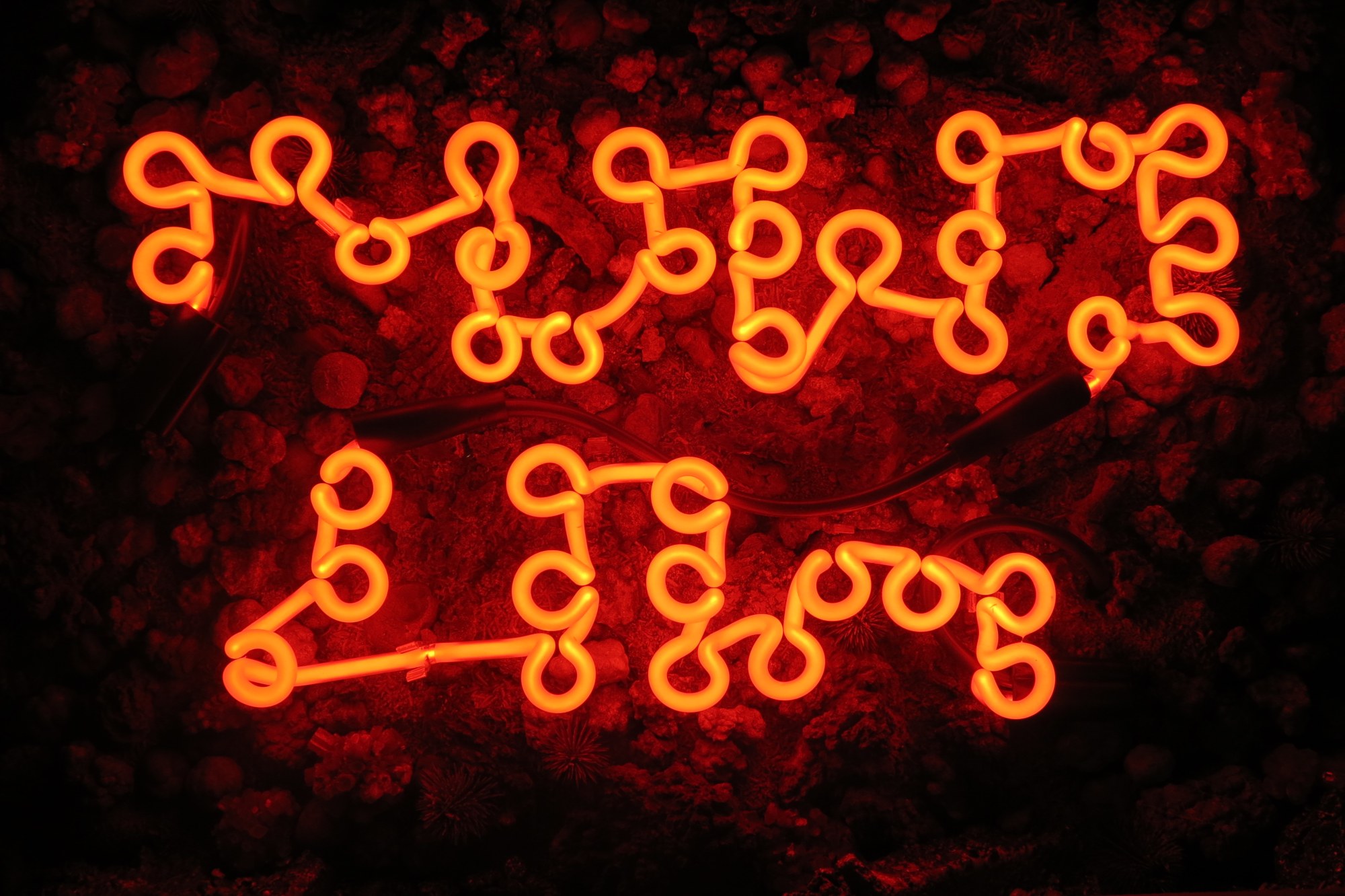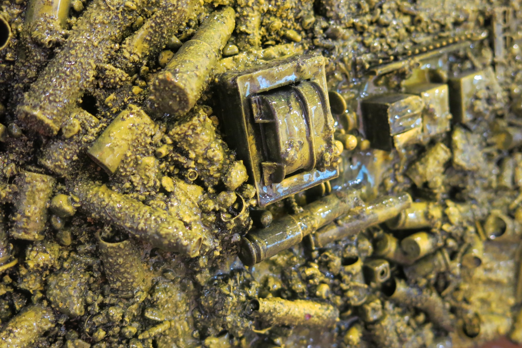- Acrylic vitrine, dried insect matter, coprolite fossils, crystals, bullet shells, found detritus, epoxy resin, neon sign, diamond plate base.