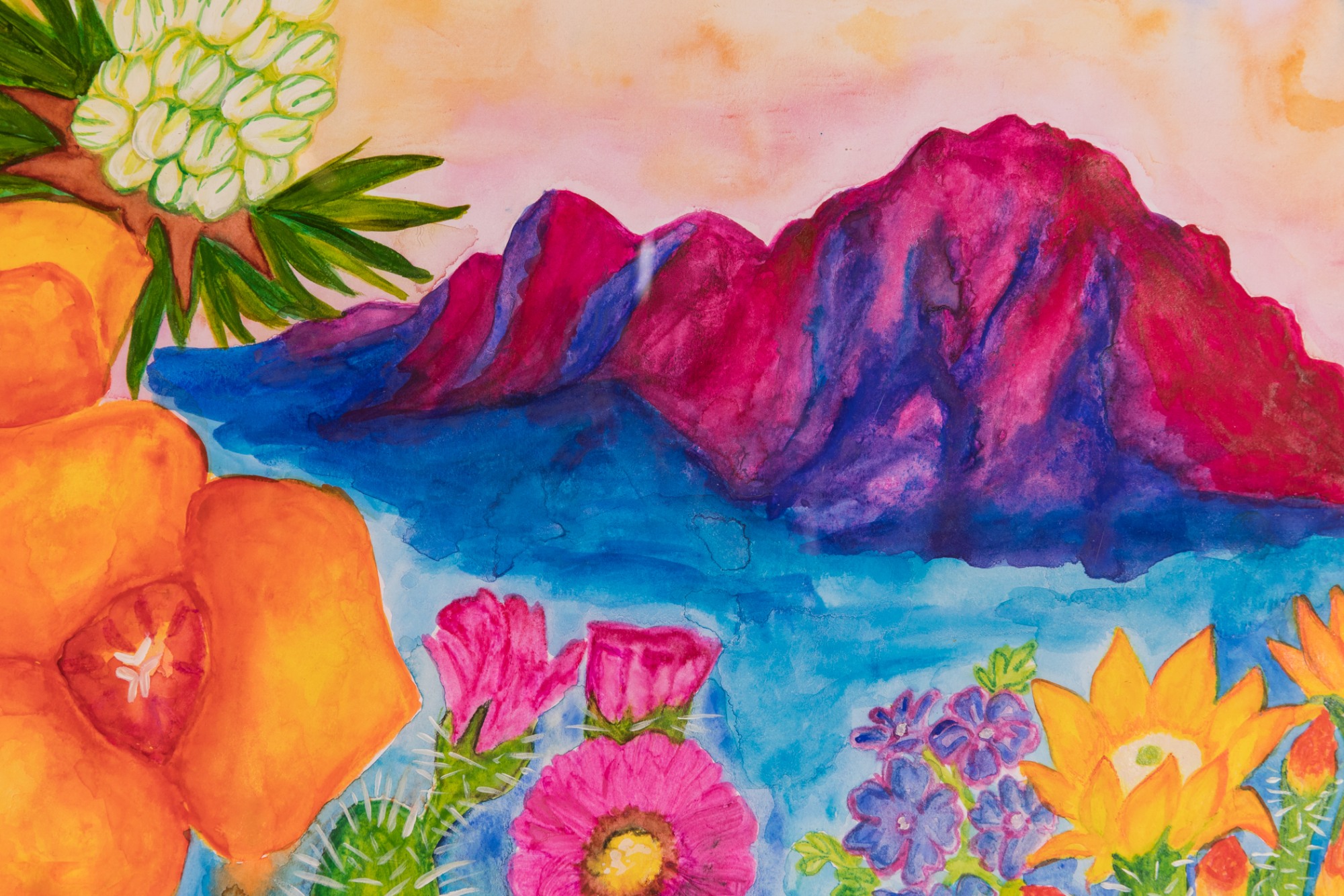 Florecer depicts various blooms found throughout the Avi Kwa Ame landscape at different times of the year. While the blooms would never all be found together or at the same time in real life, bringing them together in the painting signifies the vision and the hope that years from now we can look at a flourishing protected landscape and see the value in each action that had to take place to form such reality. A permanently protected landscape also creates space to allow us to grow and connect with it in a way that is more balanced and sustainable, allowing us (humans) to flourish into better beings.