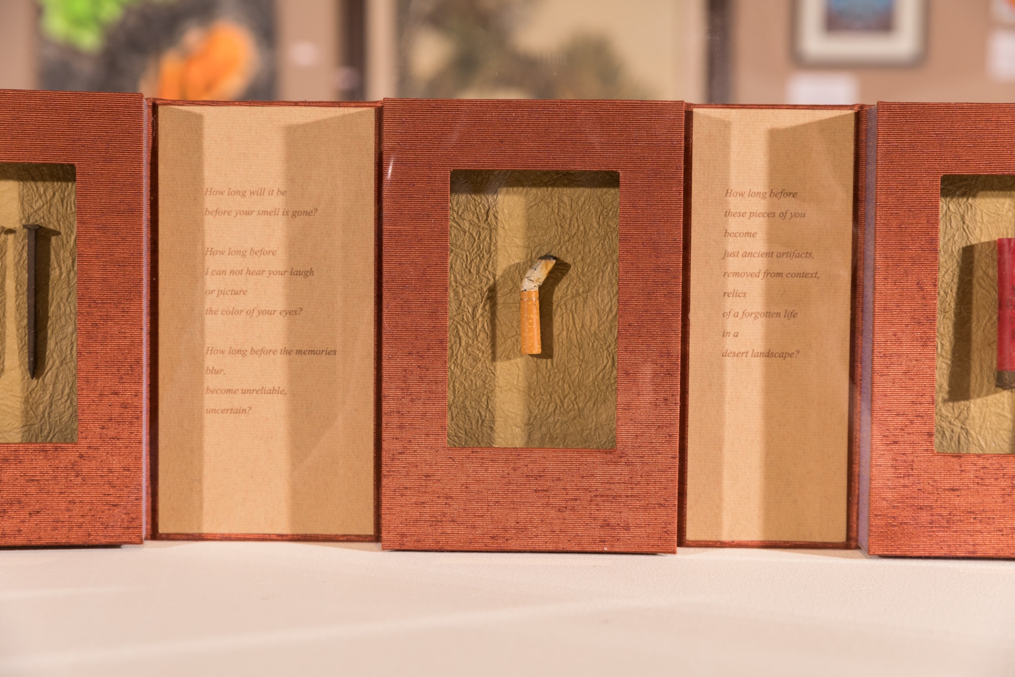 Reliquary memorializes forgotten objects found in the Mojave desert, with text centered around loss, memory, and decay. Items are revealed one by one by unraveling the box structure, concluding with a hazy photograph of the location where the objects were collected. My work reflects on navigation and utility, the reciprocal effects of human beings and our environment, and explores the mysterious, liminal space between our interior consciousness and our surroundings. Reliquary meditates on the question, “how and where is memory held in our bodies, objects and environment?”