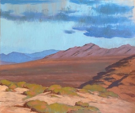 ‘ amay- sky, up, above, over, top. This painting portrays a region within the cultural lands of the Mojave Desert. The arid quality of the desert reveals a hauntingly beautiful typography further displaying dramatic mountain ranges, and eerie rock formations. This area forms part of the significant lands of Spirit Mountain, named Avi Kwa Ame by the Mojave Tribe that attributes the land to their creation and spiritual history. “Amay” depicts the natural beauty, and the culturally symbolic importance of the Mojave Desert and it’s connection to indigenous history.