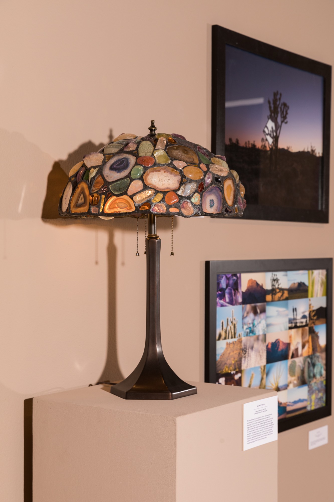 The Tiffany styled lamp represents “things of the earth – both natural and representative of man’s settlement of the Avi Kwa Ame landscape.” It was made using copper foil wrapped around the edges of each piece and then soldered together using a soldering iron. Patina was used to blacken the solder and a grinder to smooth some of the rough edges. The materials used were: Smoky Quartz; Quartz Crystals; Rose Quartz; Amethyst; Occo Agate; Opal; Carnelian ; Citrine (several types); Fluorite; Cut polished Agate slices; Adventurine; Labradorite; Turquoise; broken weathered bottle glass (green, brown, purple, white) from mine sites; bottom of historic pill box and jewelry box; piece of historic electric line insulator and glass from historic window pane.