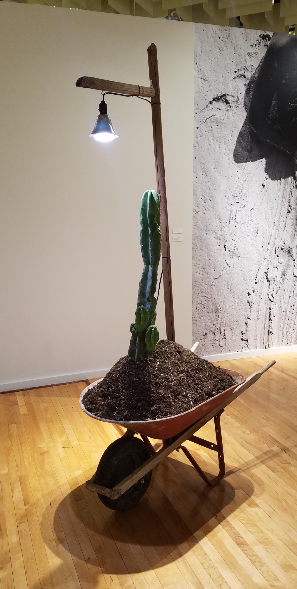 Live plant, grow light on stand, wheelbarrow, earth/dirt, water, water container