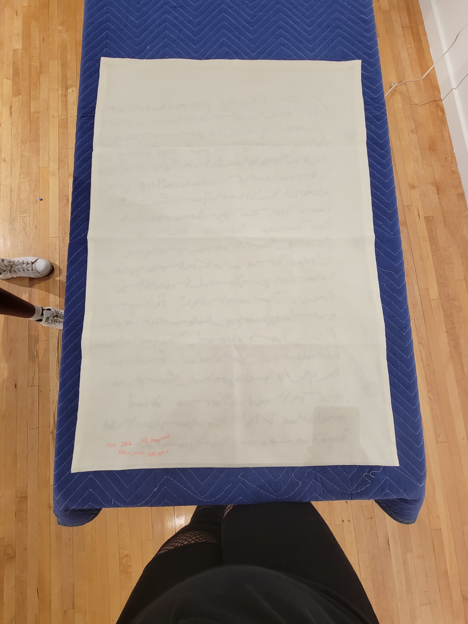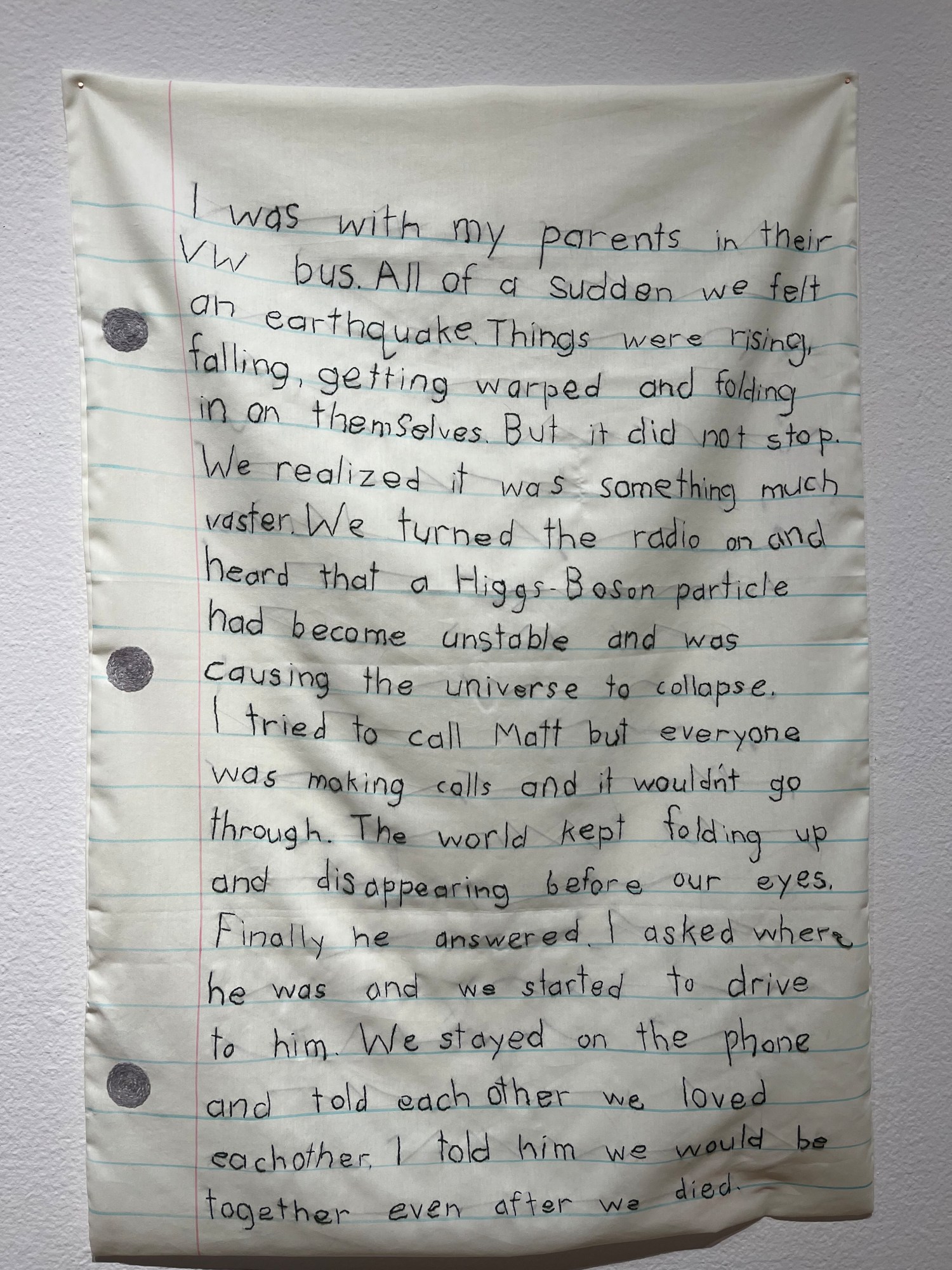In 1995 Megan Whitmarsh began having dreams of an apocalypse. “I write them down immediately upon waking. Each one is vivid and feels devastating,“ she remembers. “I was a child in the 1980s during the Cold War and my mother was very active in the peace and nuclear disarmament movement, twice being jailed for civil disobedience. My mom told me she decided to go to jail over this because of a dream she had about the aftermath of nuclear war and my little brother. Maybe this led to my dreams or maybe it is just a collective shadow of fear that visits me. Apocalypse means: to uncover.” Recreated, years later, in fabric, the dream memories became part of the world she creates through her art, one in which the violent clamor of contemporary reality is infused with the possibility of supernatural events and magic.