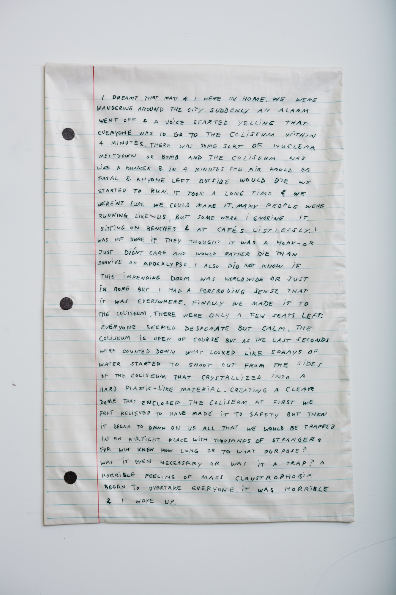 In 1995 Megan Whitmarsh began having dreams of an apocalypse. “I write them down immediately upon waking. Each one is vivid and feels devastating,“ she remembers. “I was a child in the 1980s during the Cold War and my mother was very active in the peace and nuclear disarmament movement, twice being jailed for civil disobedience. My mom told me she decided to go to jail over this because of a dream she had about the aftermath of nuclear war and my little brother. Maybe this led to my dreams or maybe it is just a collective shadow of fear that visits me. Apocalypse means: to uncover.” Recreated, years later, in fabric, the dream memories became part of the world she creates through her art, one in which the violent clamor of contemporary reality is infused with the possibility of supernatural events and magic.