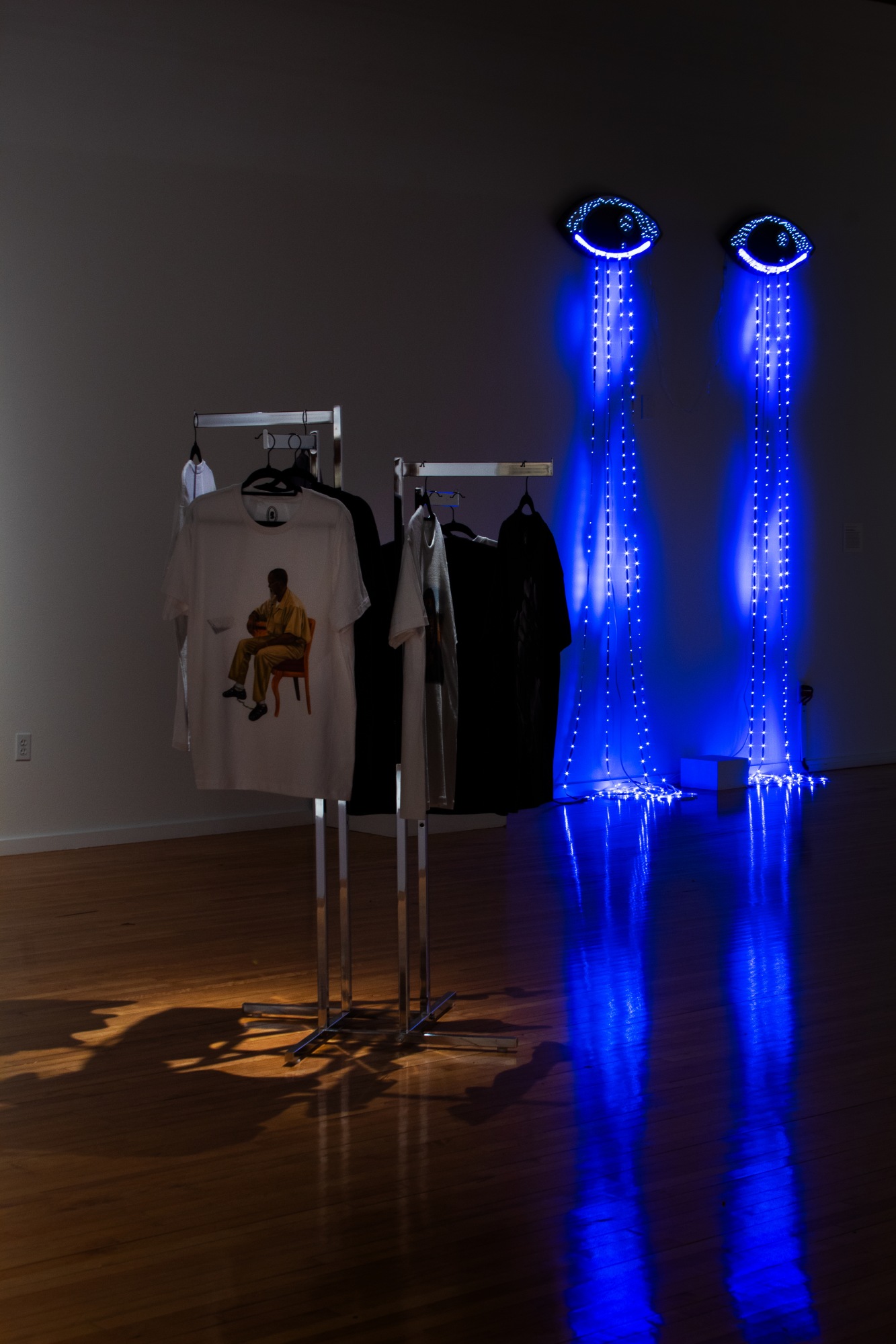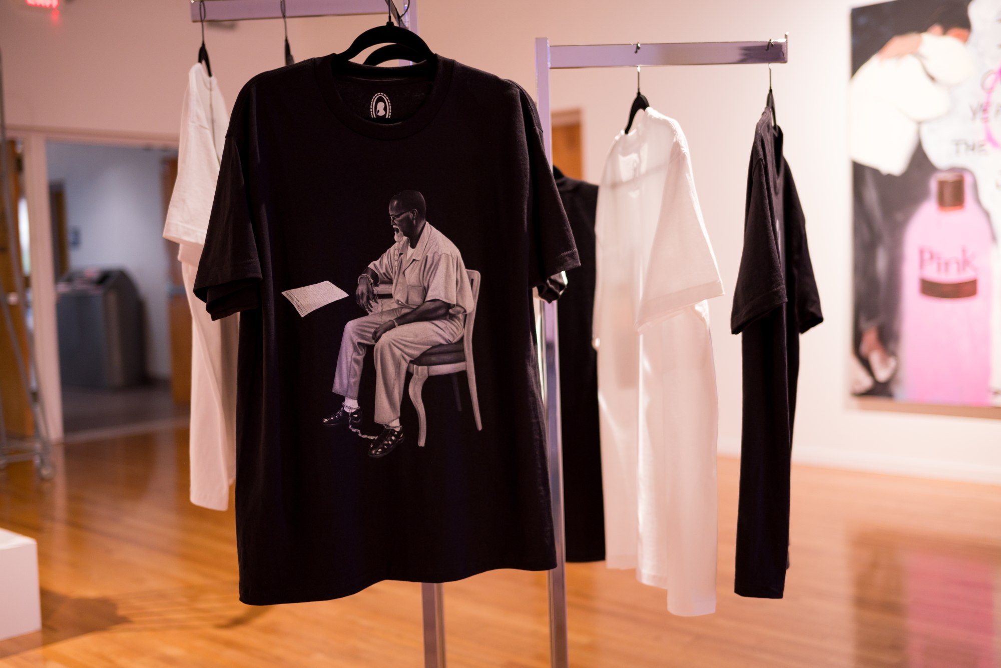 Fulton Leroy Washington—also known as MR. WASH—specializes in photorealistic paintings of people experiencing strong emotions. Imprisoned for a nonviolent drug offense in the 1990s, he taught himself to paint by creating artworks that depicted the troubles and sorrows of his fellow inmates. In 2014 he painted an image of President Barack Obama granting him clemency. In 2016 the painting became a reality when the president commuted his sentence. (The image of the artist sitting on a chair, seen here on a t-shirt, is excerpted from that artwork.) Now based in Compton, California, he continues to create art. In February 2024 he will hold his first solo exhibition at Jeffrey Deitch Gallery in Los Angeles. By exhibiting his paintings on shirts purchased from his online store, we hope to highlight the way we all share our emotions and allegiances with the community around us through the things we choose to buy and wear.